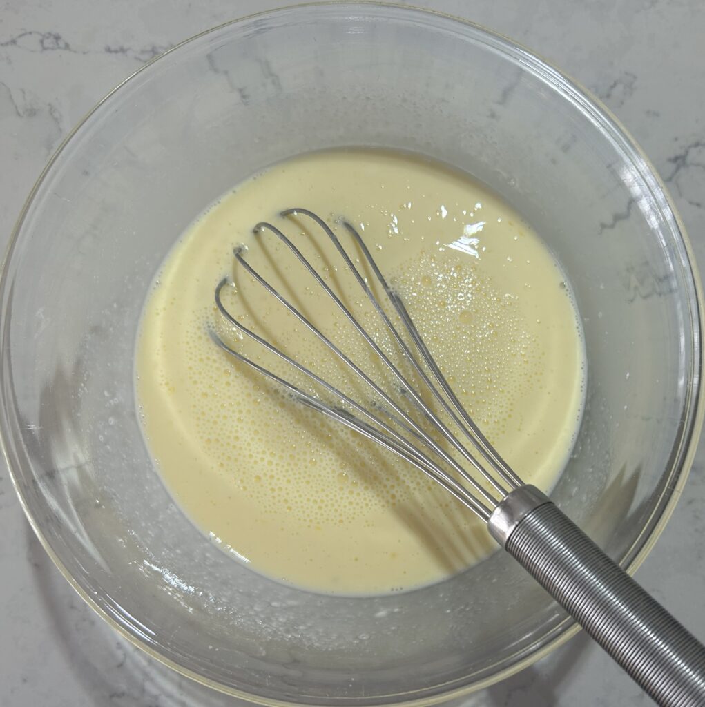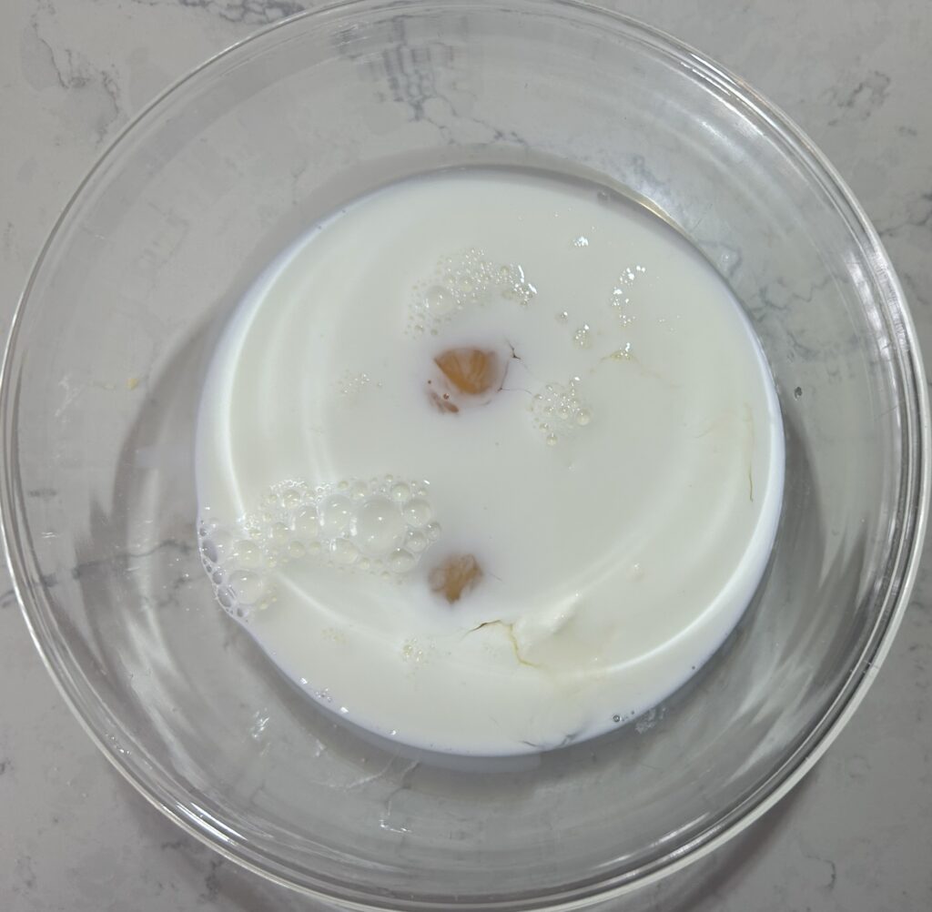 別の器で、牛乳、ヨーグルト、卵混ぜ合わせてから、粉類のボールに加えて、全体を混ぜ合わせます。