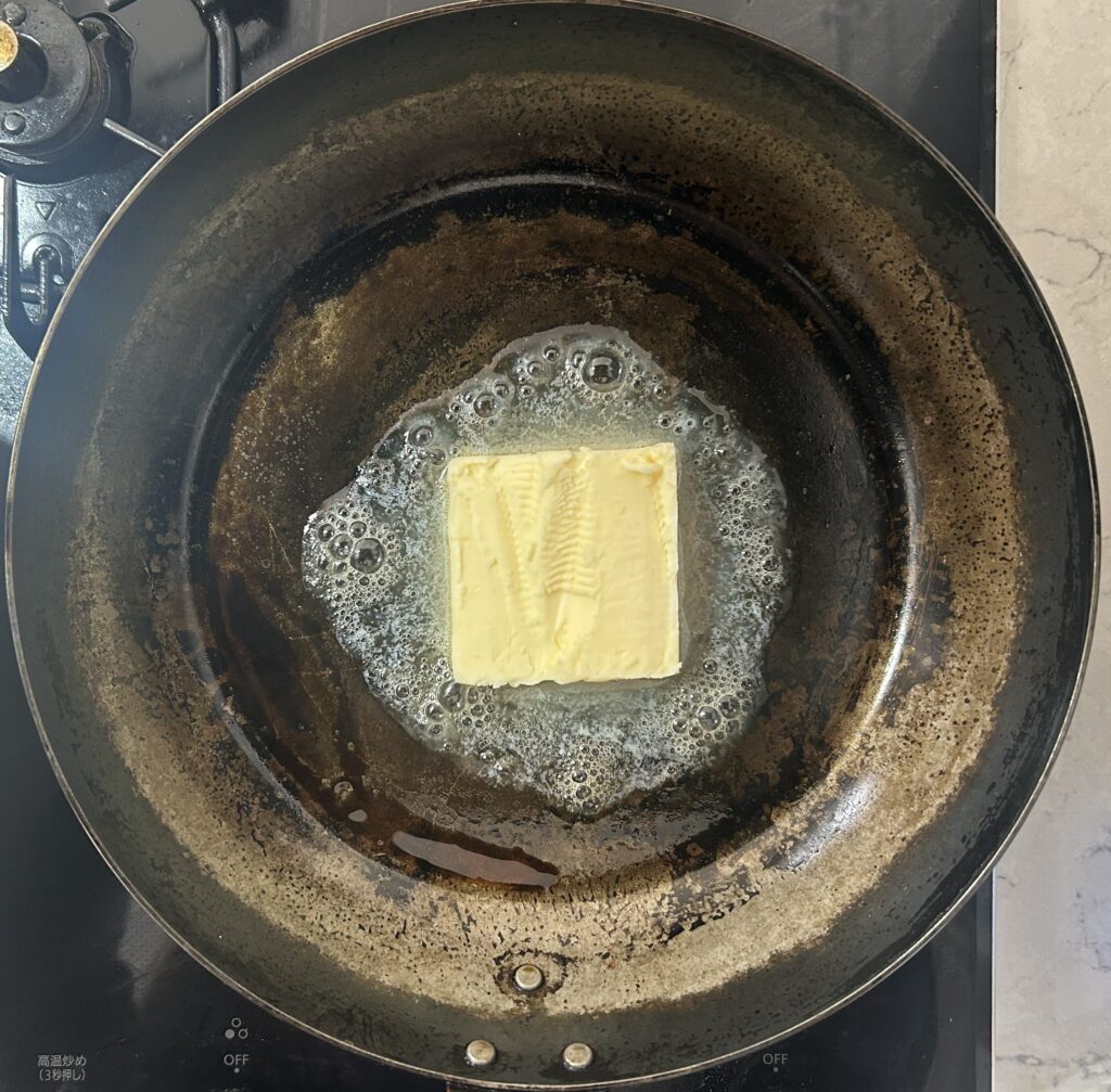 フライパンは、オーブンであらかじめ温めておき、無塩バターを入れて溶かします。溶けたバターが、フライパン全体をコーティングするようになじませます。