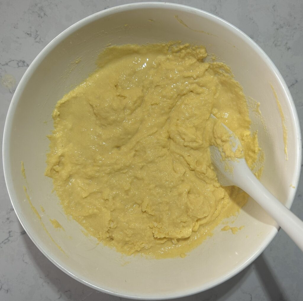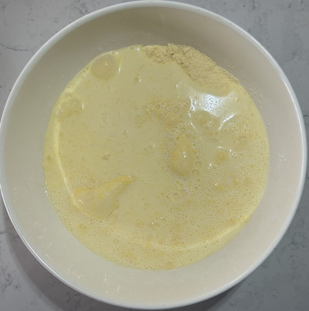 混ぜ合わせたカスタード液を、粉類が入ったボールに入れて、ざっくりと混ぜます。