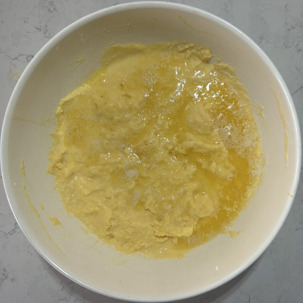 溶けたバターをボールに加えます。