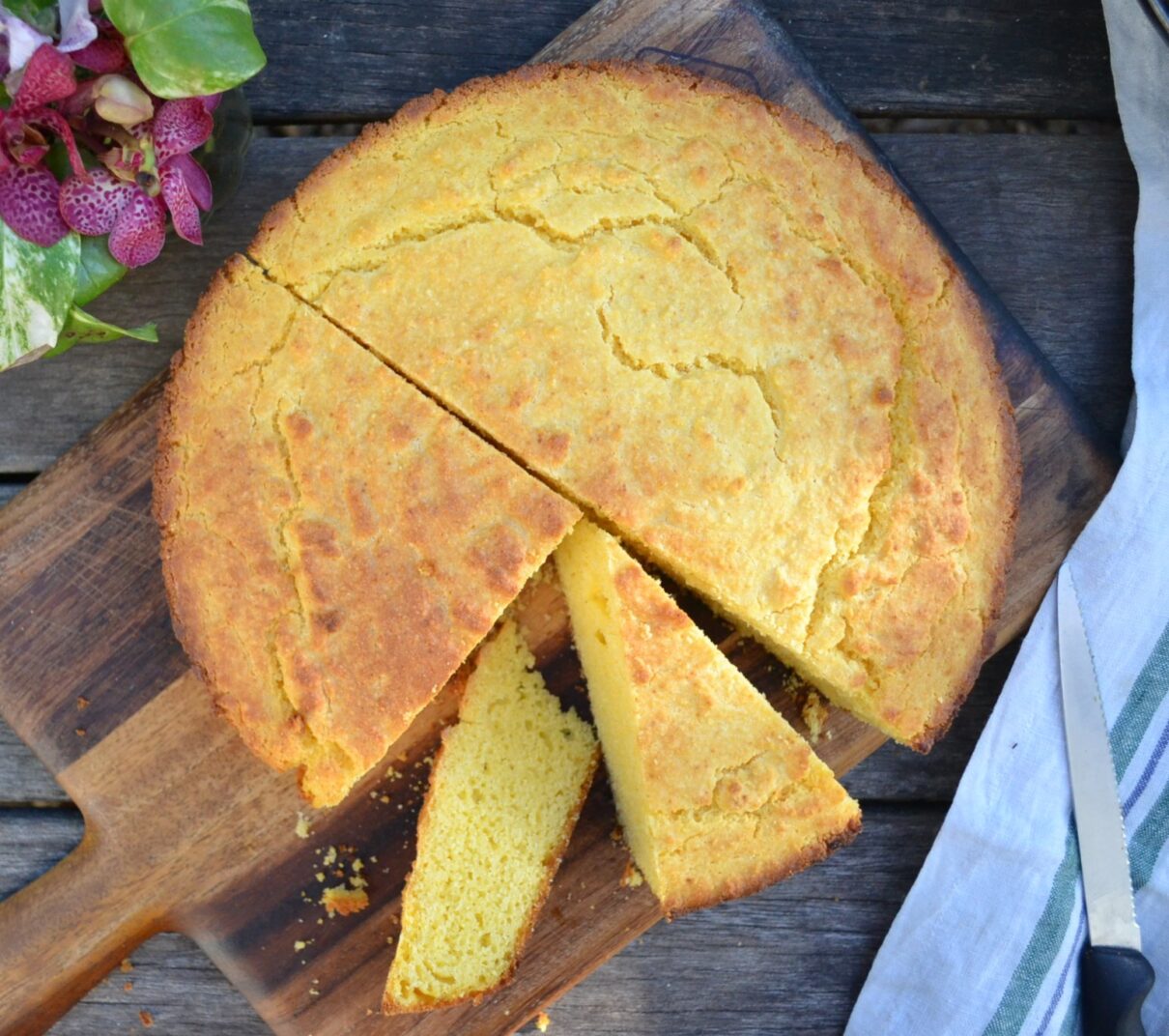 今回は、フライパンを使って、お砂糖は控えめにしたレシピで作っています。黄色いコーンミールを使い、バターミルクの変わりに、ヨーグルトと牛乳を使っています。コーンブレッドは、バターとの相性がいいので、軽くトーストして、溶かしたバターを添えると絶品です。パンケーキのように、甘いメープルシロップや蜂蜜をかけても、美味しいです。