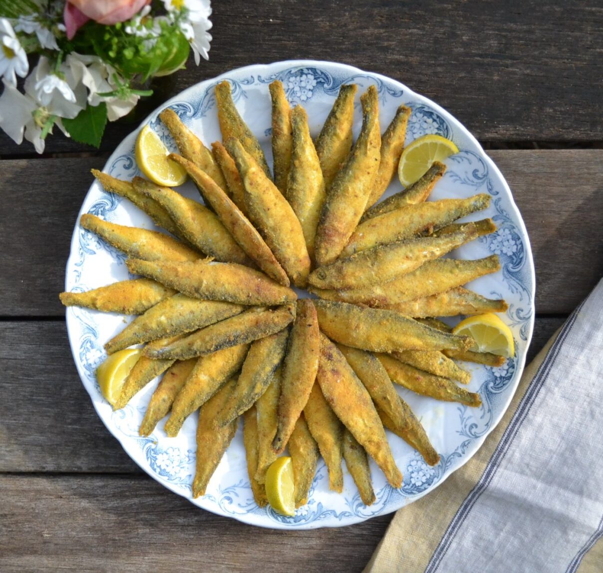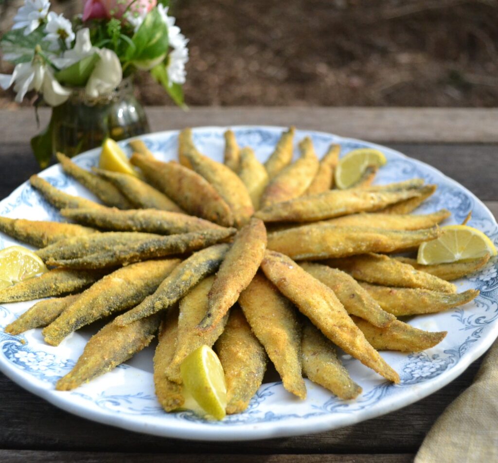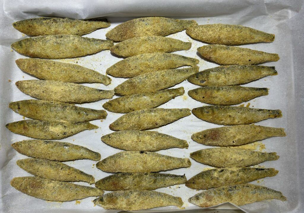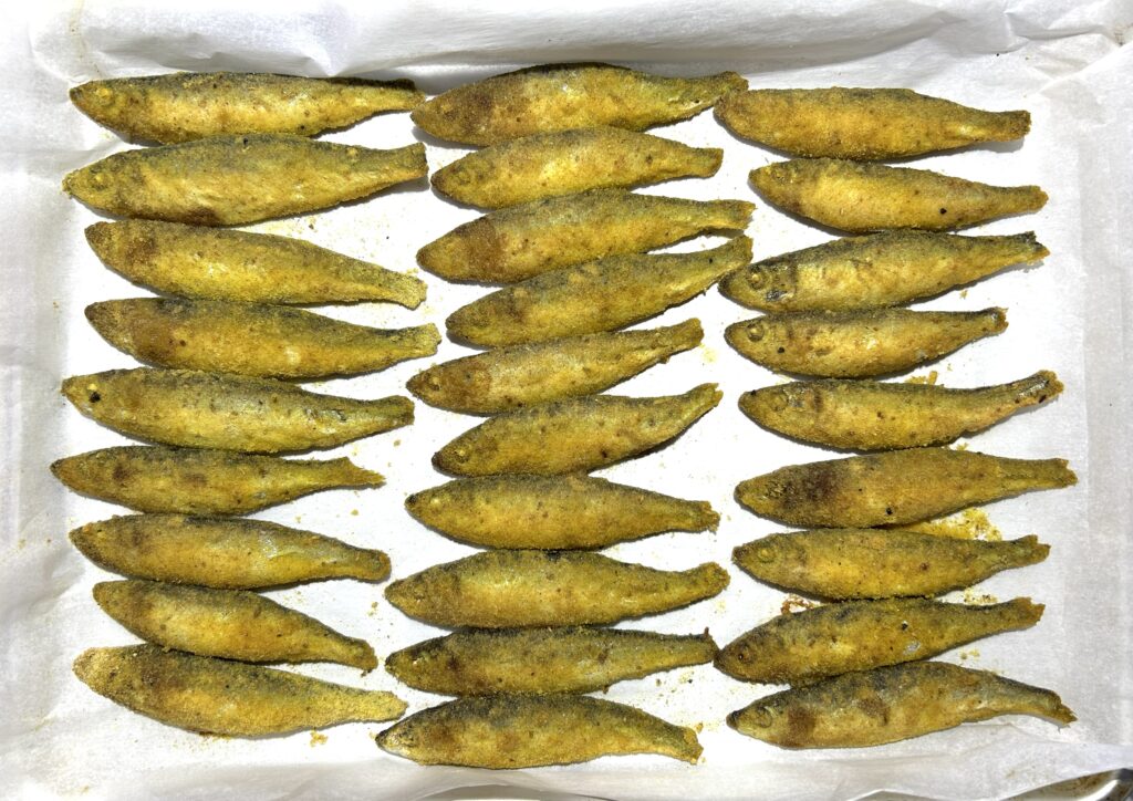 小さめのいわしに、コーンミールをまぶして、オーブンで焼いてつくる、クリスピーサーディン (Crispy Sardines) です。油で揚げないので、さっぱりとヘルシーにいただけて、調理も簡単です。コーンミールには、ターメリックやクミンなど、ほのかなカレー風味が味わえるので、魚の風味が苦手な人でも、食べやすく仕上げています。