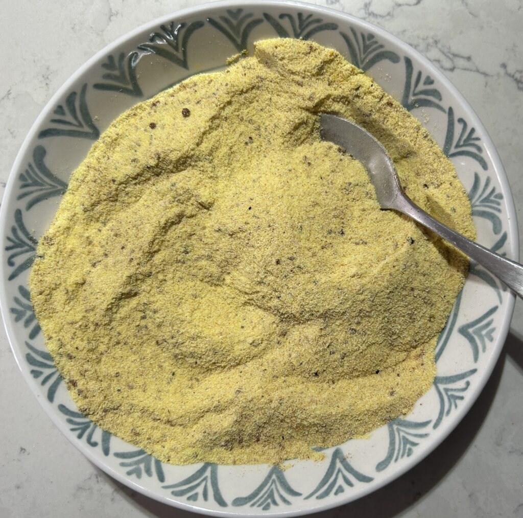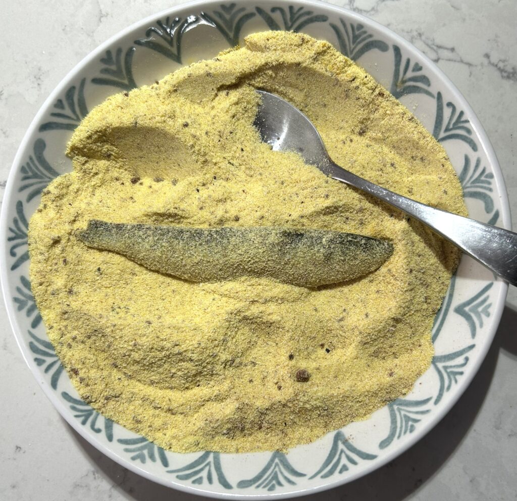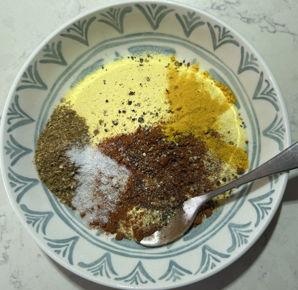 衣を用意します。コーンミール、ターメリック、クミン、コリアンダー、パプリカ、黒胡椒、塩を容器に入れて、混ぜ合わせます。