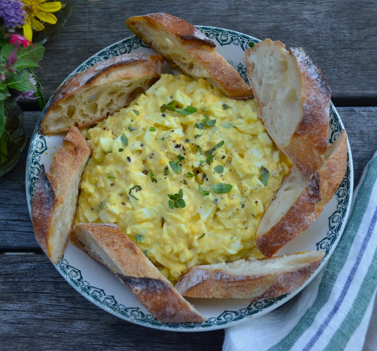 ゆで卵をマヨネーズで和えた、シンプルなエッグサラダです。クリーミーなマヨネーズソースが中心なので、サラダというよりも、濃厚なディップのような仕上がりです。ディップのように、フランスパンやクラッカーに添えたり、サンドイッチの具材にしたり、レタスにのせたりして味わいます。