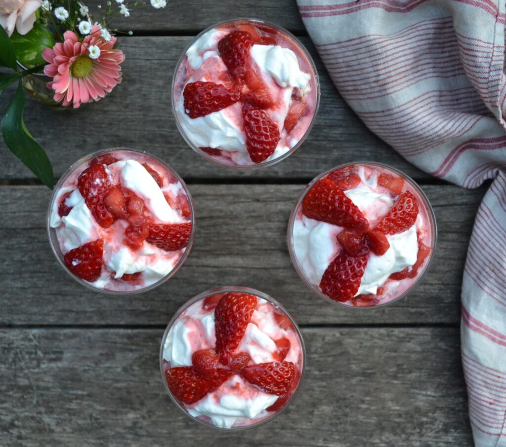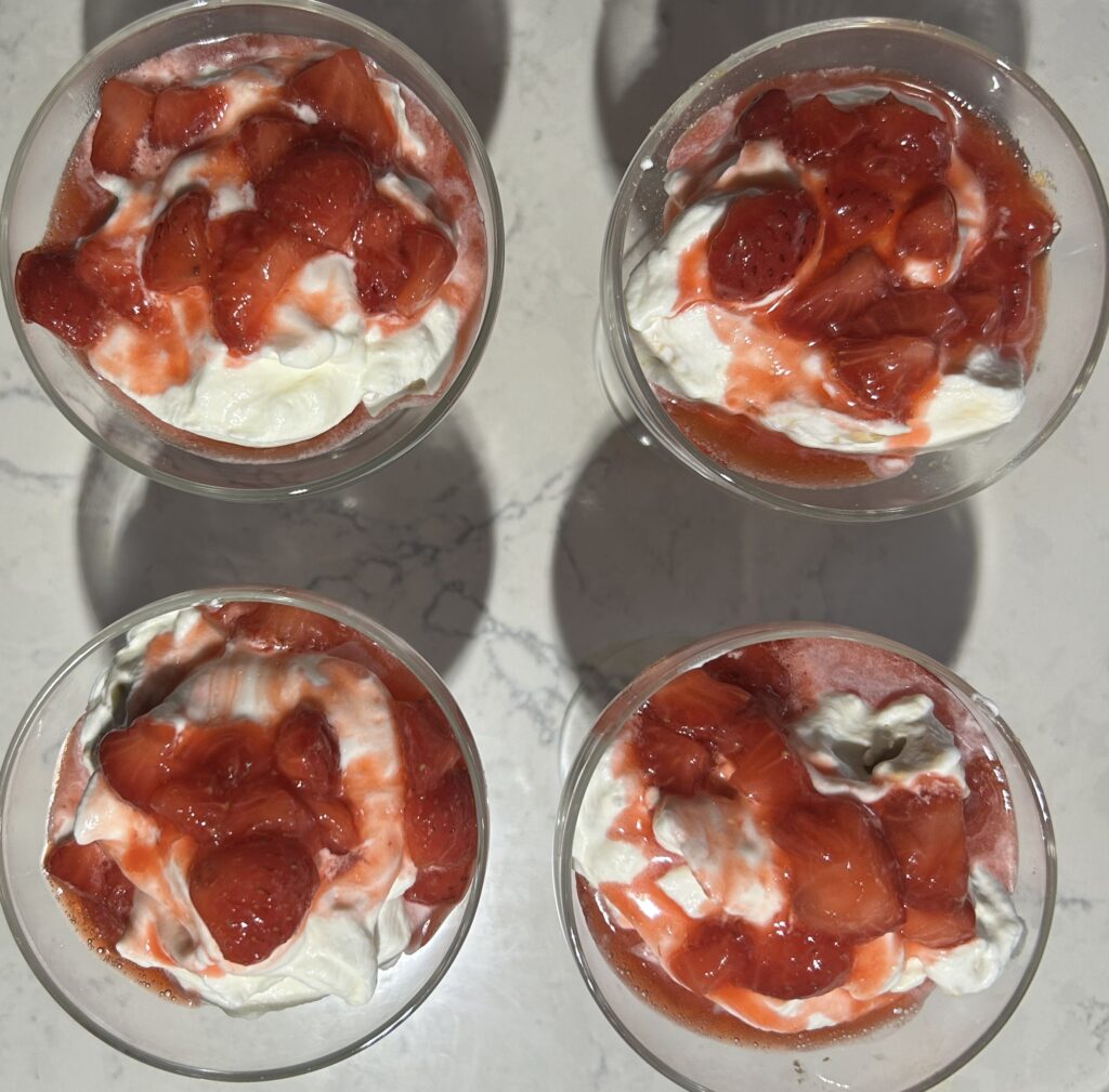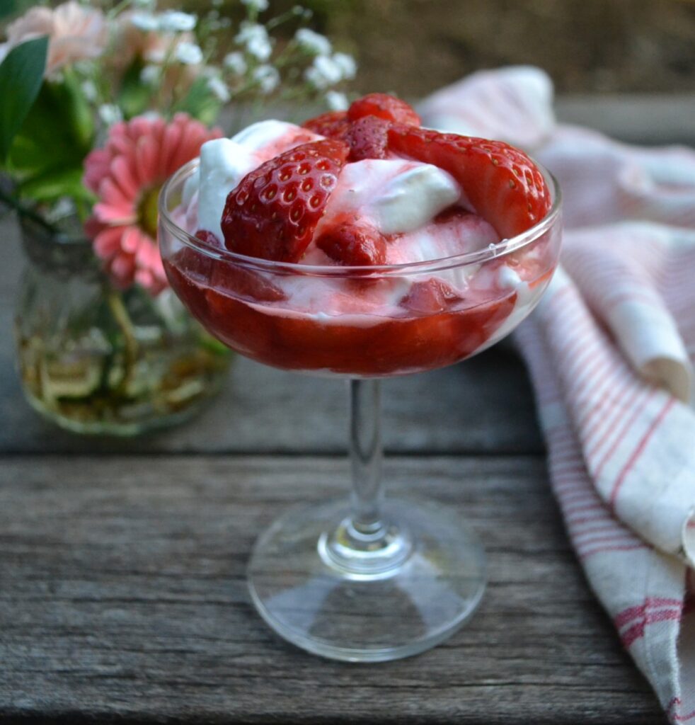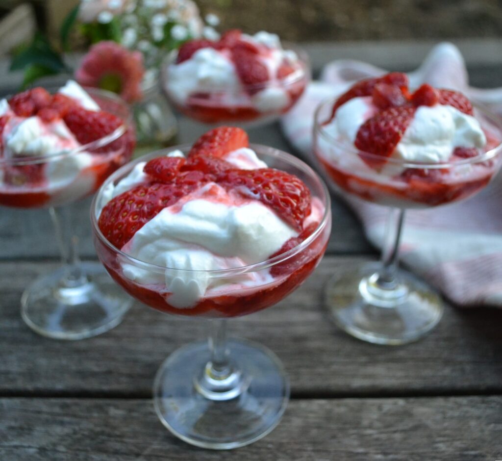 苺と生クリーム、メレンゲクッキーで作る、イギリスの伝統的なデザート、イートンメス (Eton Mess) です。全寮制の名門校、イートン・カレッジ (Eton College) が発祥と考えられており、毎年、クロケットの試合で提供されたことから、イギリスの初夏のデザートとして、知られるようになりました。苺がおもに使われますが、ブルーベリーやラズベリーなどの、ベリー類がともに添えられることもあります。苺やベリーの酸味と、メレンゲの甘さのバランスがよく、誰からも馴染みやすい、食べやすいデザートです。