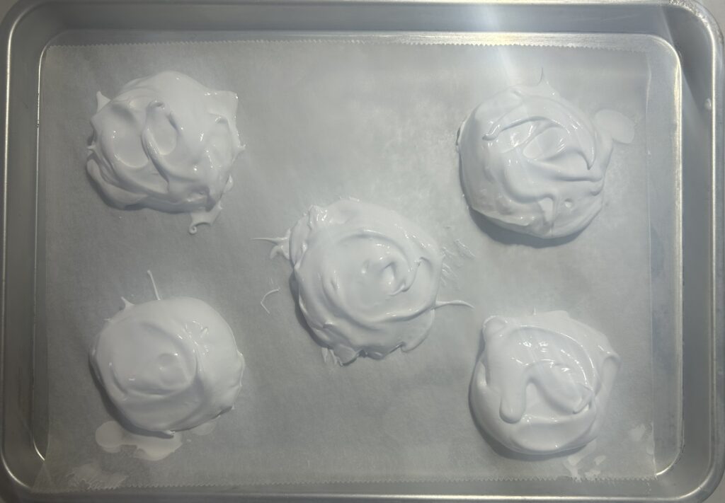鉄板にベーキング用の紙を敷いてから、メレンゲをスプーンで掬って、直径5センチ程度の円盤状にして、鉄板に並べる。