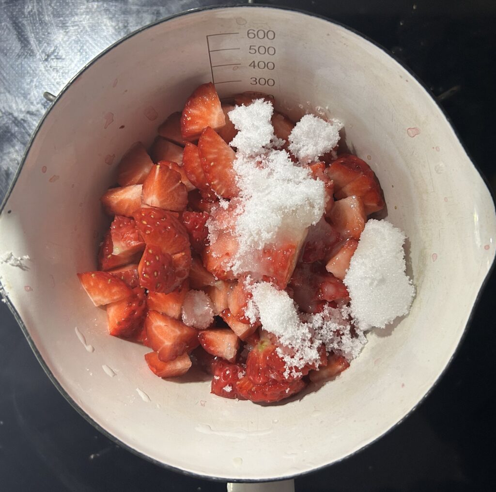 苺ソースを作ります。苺は飾り用に、少量を残しておいて、残りの苺は、角切りにします。角切りにした苺と砂糖を鍋に入れて、中火にかけます。