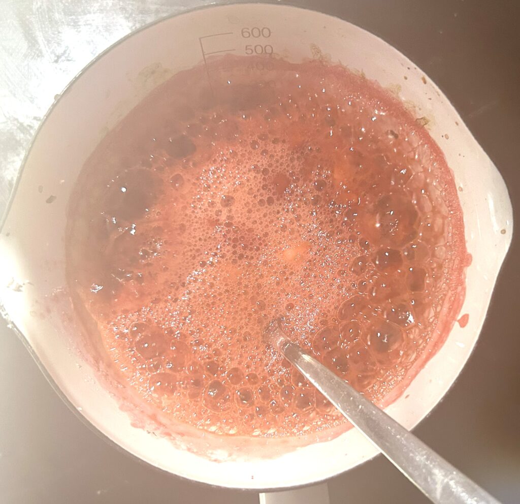 時々かき混ぜながら、苺が煮崩れてくるまで、加熱します。レモンの果汁と好みで、グランマニエなどの洋酒を加えて、火を止めます。出来上がった苺ソースは、別の容器に移して、よく冷ましておきます。