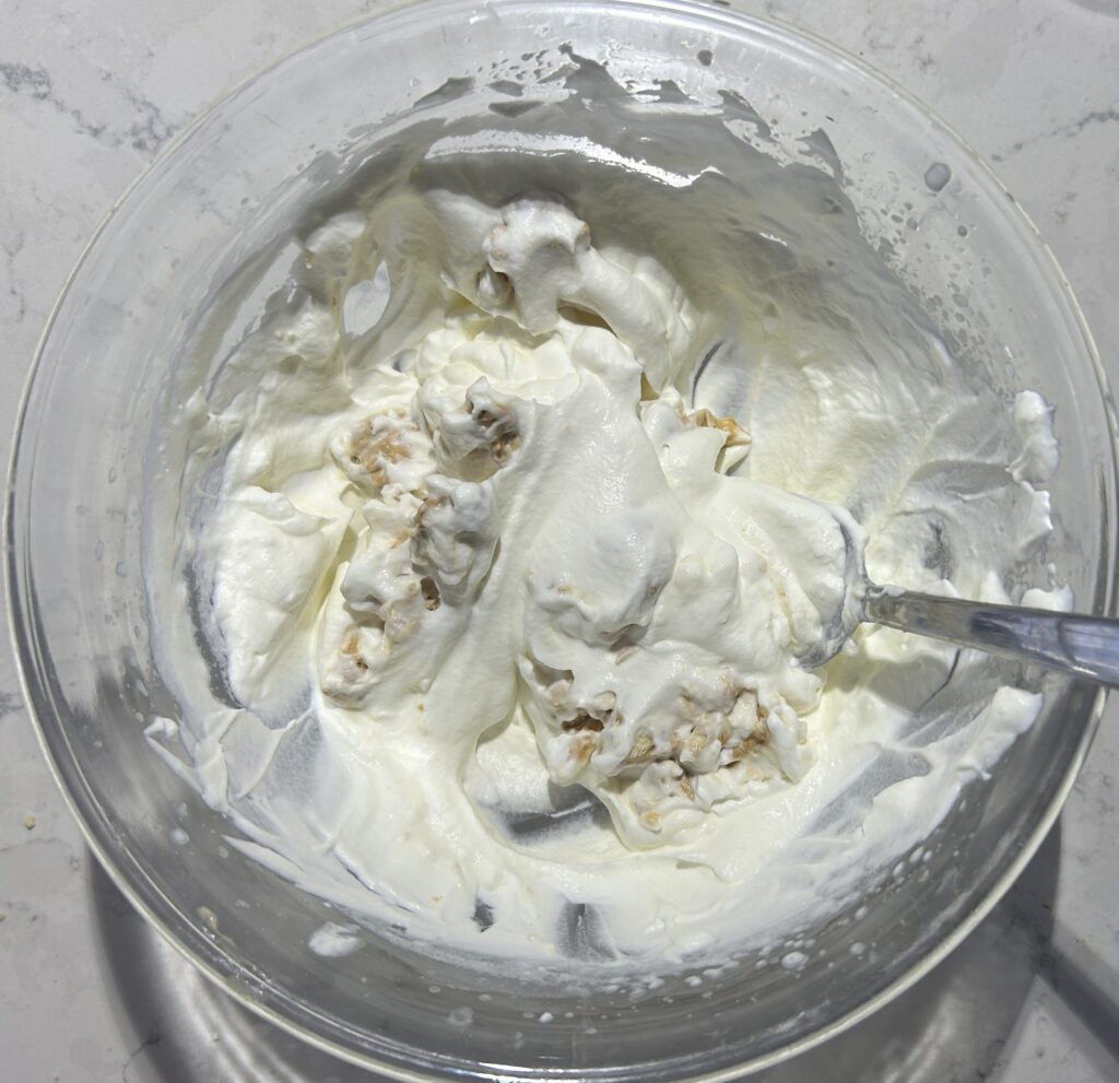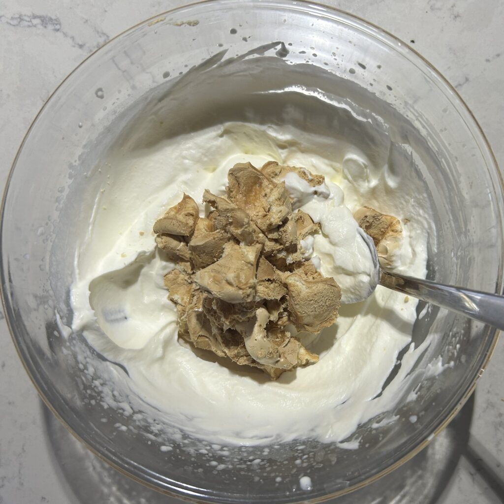 メレンゲクッキーを食べやすい大きさに砕いてから、ホイップした生クリームに加えて、混ぜ合わせます。