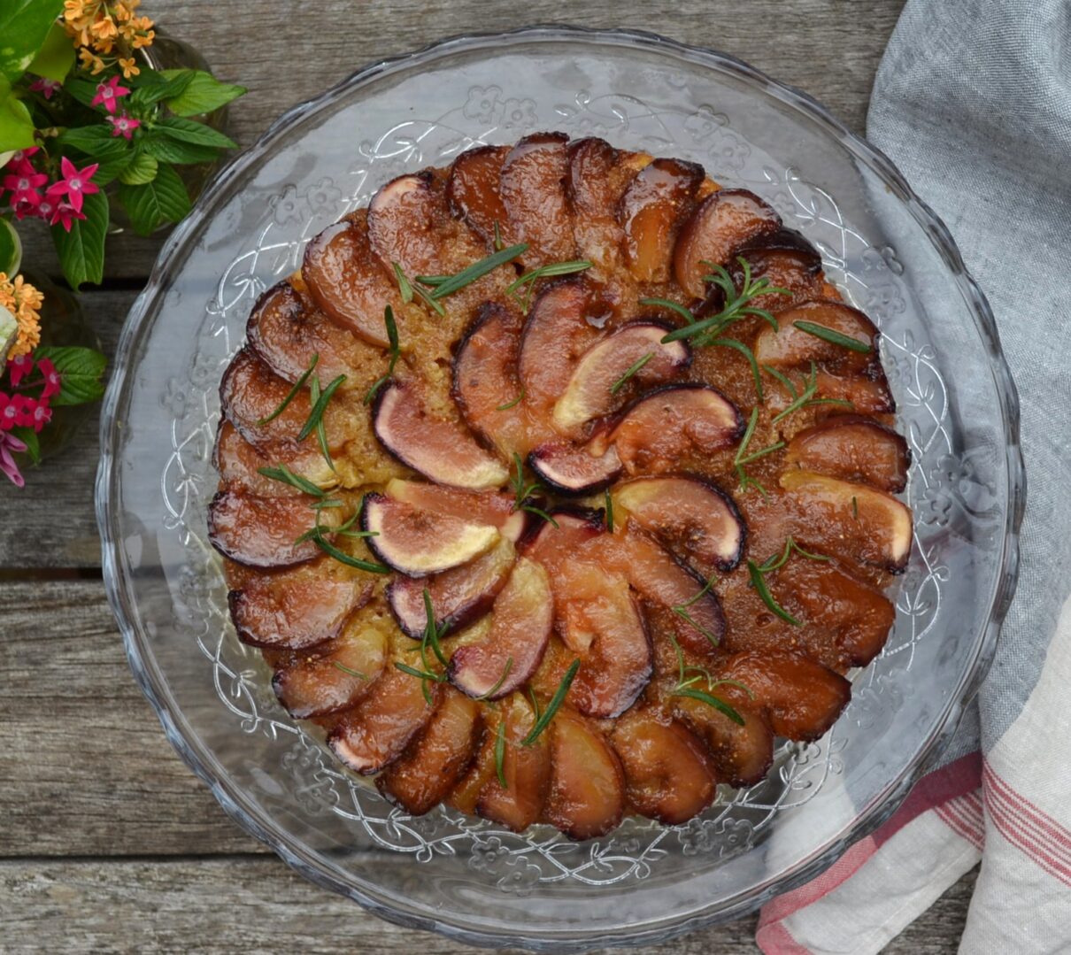 フレッシュな無花果を使った、アップサイドダウンケーキ (upside down cake) です。ローズマリーの香りをきかせて、バルサミコ酢と蜂蜜を加えています。バルサミコ酢のかわりに、オレンジやレモンの果汁を少量加えてもいいと思います。