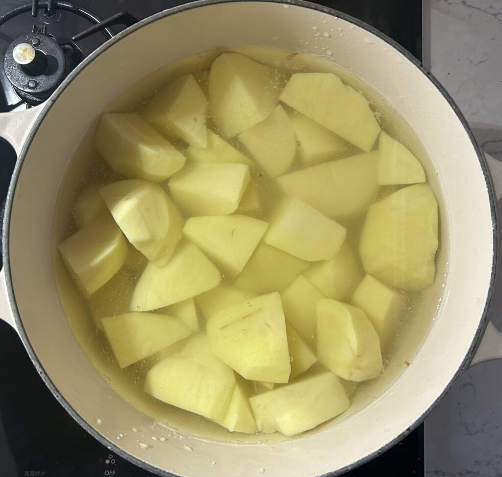 マッシュポテトを作ります。じゃが芋は皮をむいて、茹でやすい大きさに切ります。鍋にじゃが芋とかぶるくらいの水を加えて、火にかけます。沸騰したら火を弱めて、じゃが芋が軟らかくなるまで、加熱します。