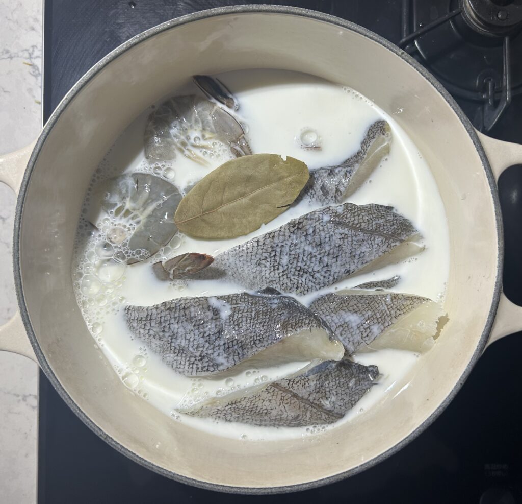 シーフードを準備します。鍋に鱈の切り身、海老、ローリエ、牛乳を入れて、中火にかけます。沸々としてきたら火を弱めて、海老や鱈に火が通るまで、加熱します。