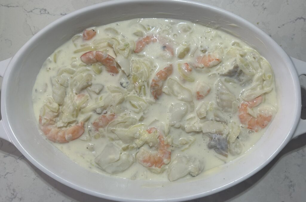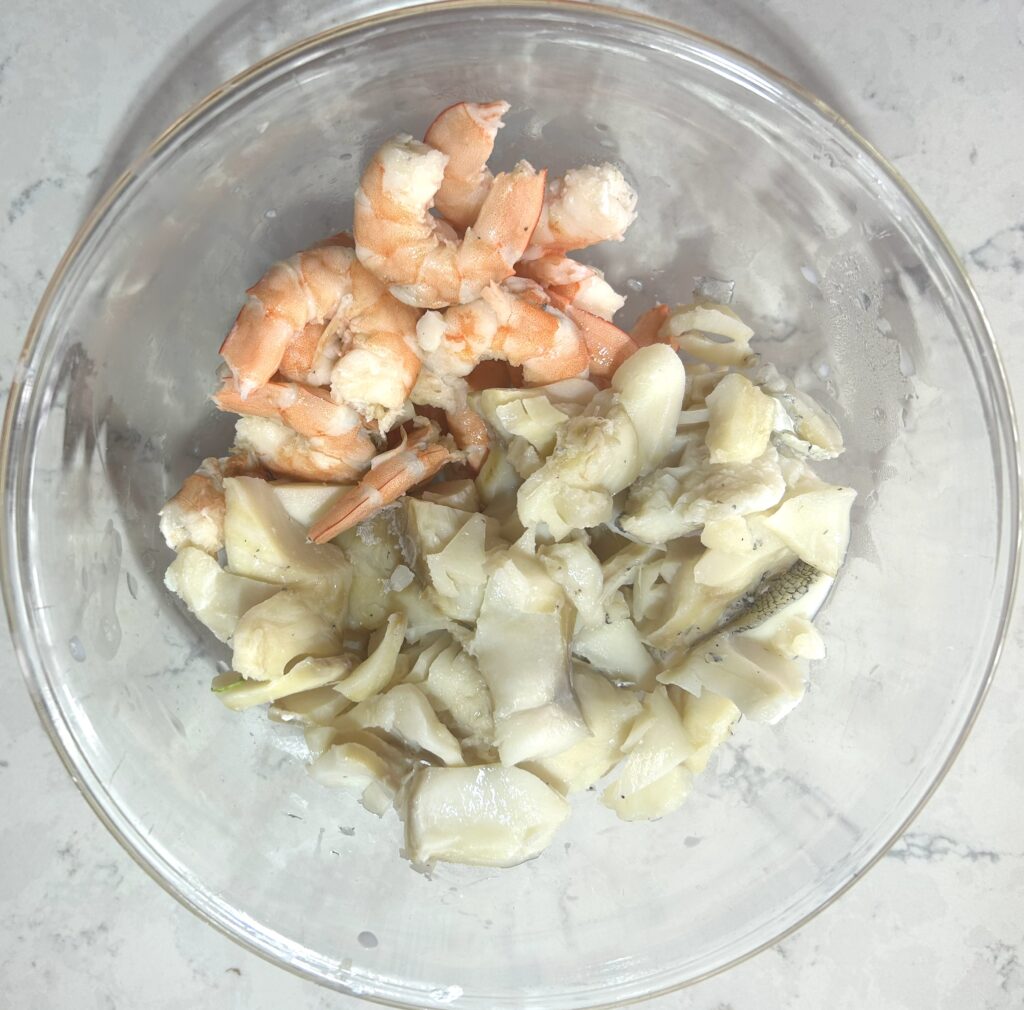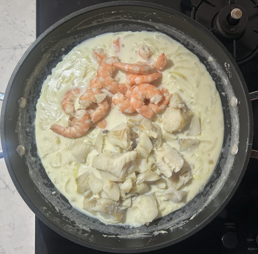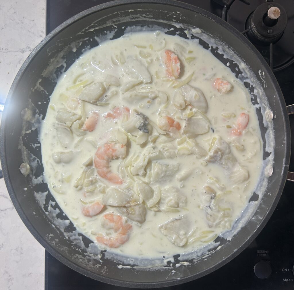 シーフードだけを鍋から取り出します。海老は皮をむいて、尾を取り除きます。鱈は皮をむいて、骨を取り除きます。牛乳はソースに使うので、残しておきます。
