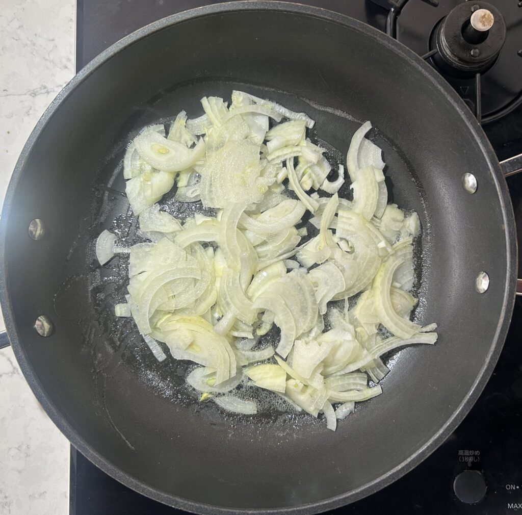 バターが溶けたら、薄切りにした玉ねぎを入れて、炒めます。