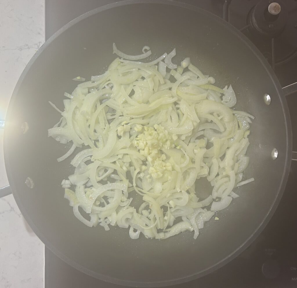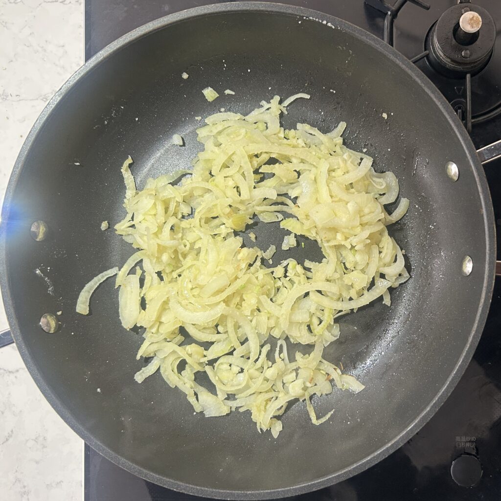 玉ねぎがしんなりとしてきたら、微塵切りにしたニンニクを加えて、さらに炒めます。
