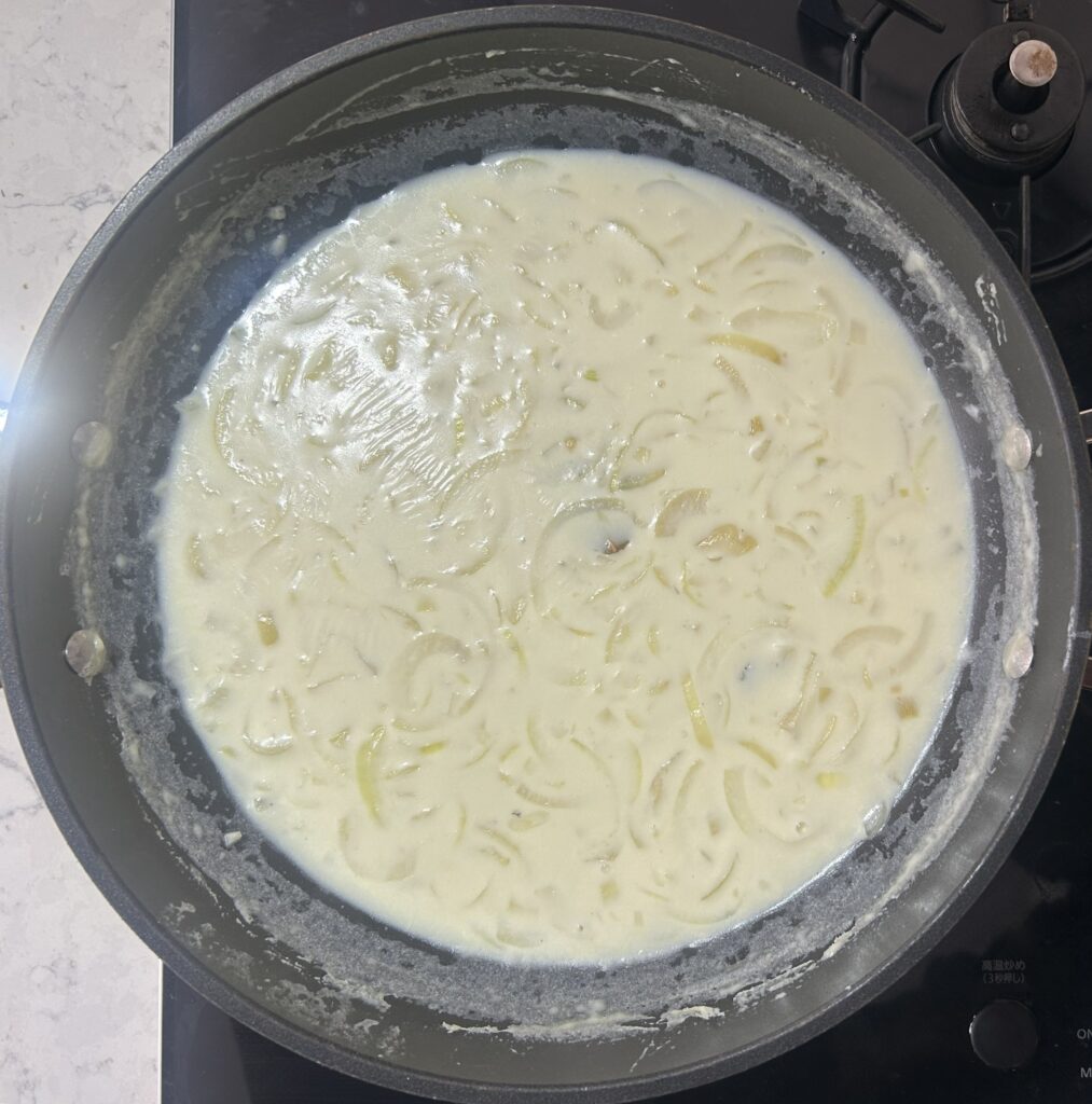 白胡椒、塩、ナツメグを加えて、味を調えます。