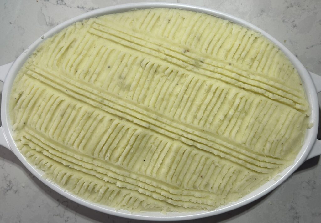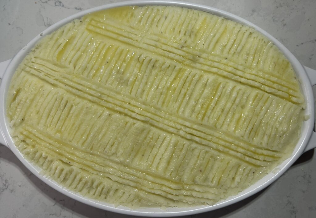 ❾ベーキングディッシュにバターを塗って、❻ のシーフードを敷き詰める。その上にマッシュポテトを満遍なくならし、フォークで表面を整える。表面に溶かしたバターを塗る。