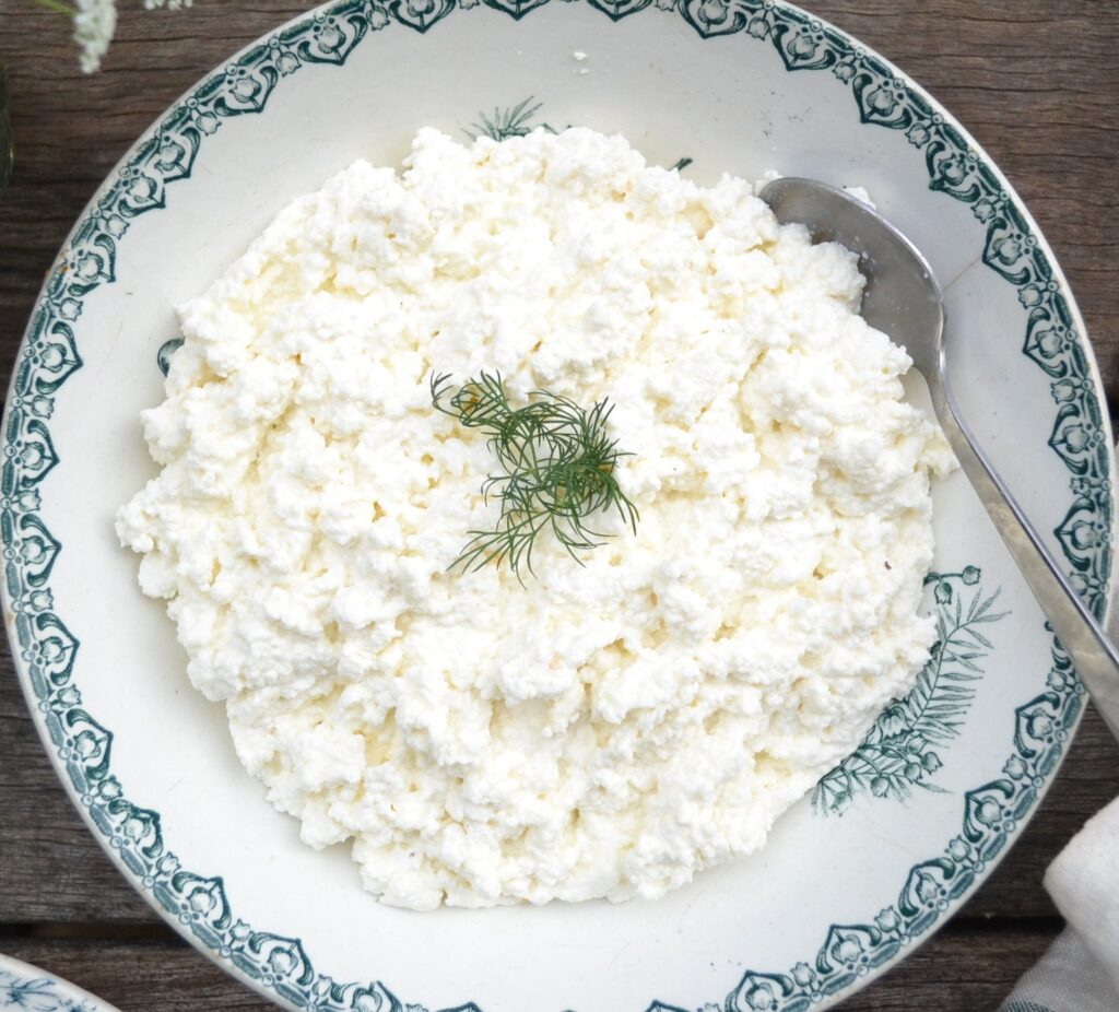 牛乳からつくる、自家製のカッテージチーズ (Homemade Cottage Cheese) です。自家製のカッテージチーズは、牛乳にレモンの果汁やお酢を加えて、たんぱく質が凝固してできるカードから作るので、見た目も作り方もリコッタチーズに似ています。カッテージチーズは、カードを作ったあとに、さらに生クリームやヨーグルトを加えて、クリーミーな食感を残すようにして仕上げるのが特徴です。