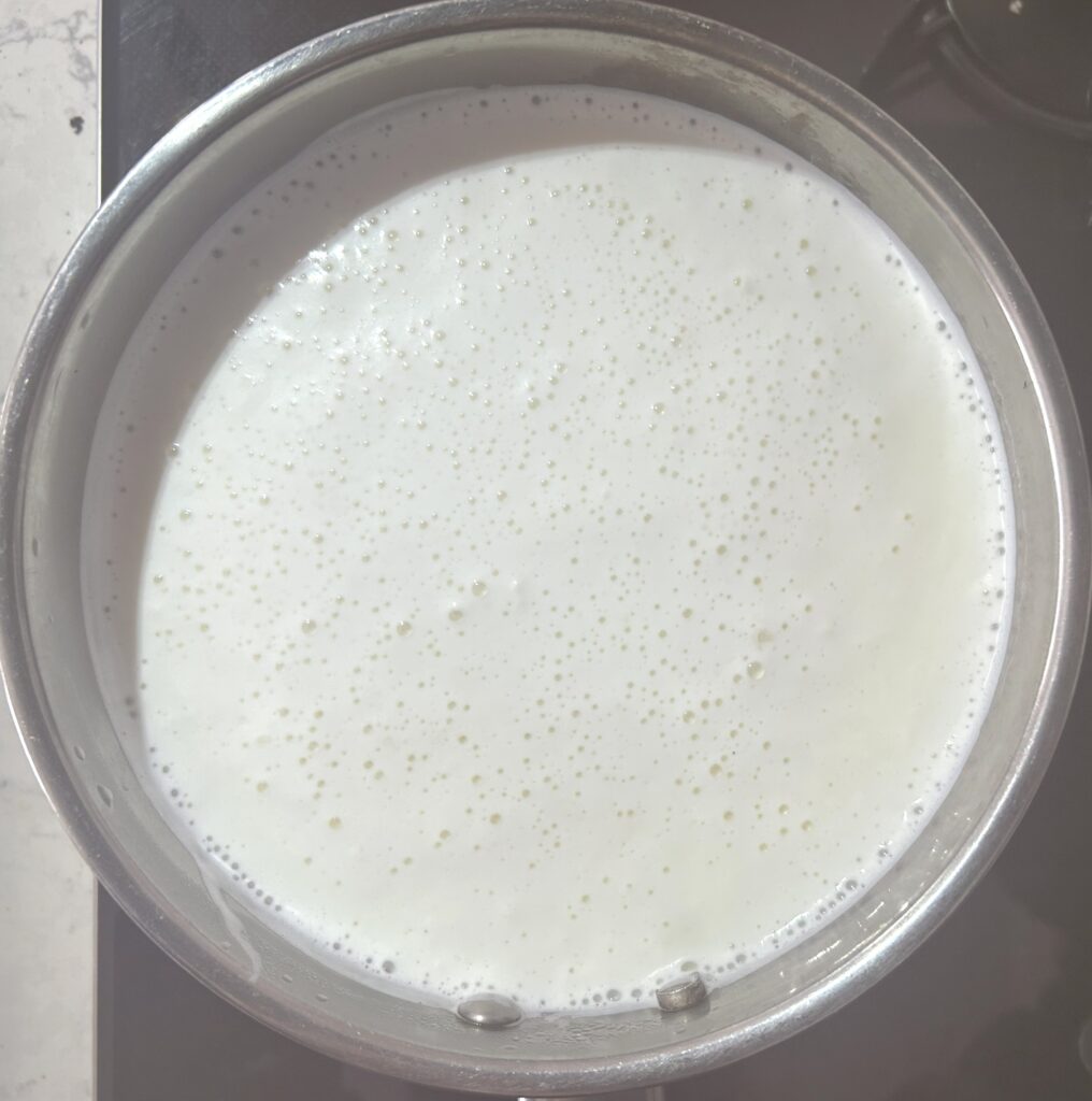 鍋に牛乳を入れて、中火にかける。時々かき混ぜながら、沸騰直前まで蓋をしないで温める。