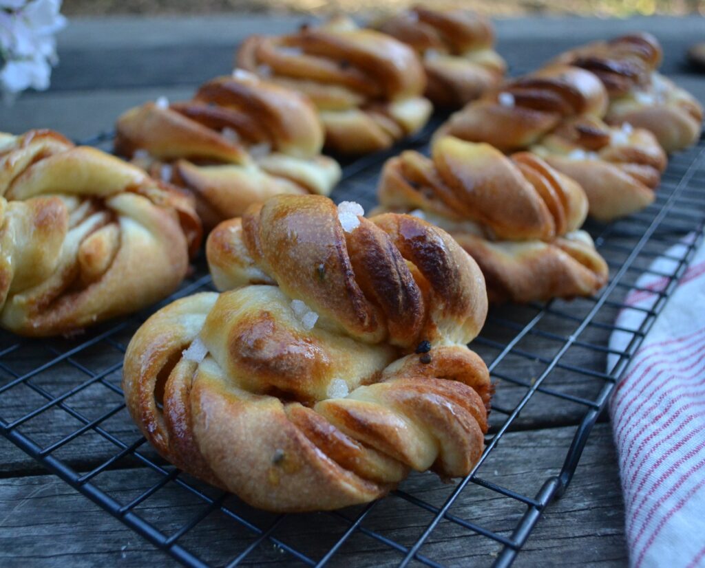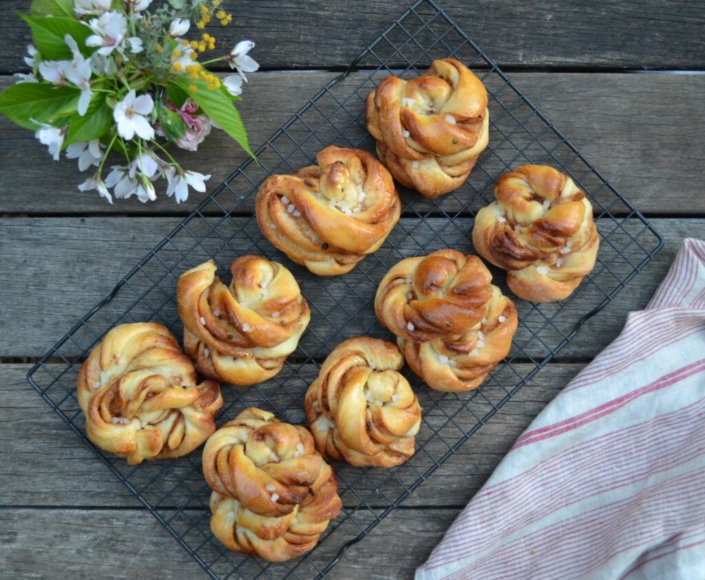 アメリカのシナモンロールとの違いは、まず、フロスティングやアイシングなどを使わないで、シンプルにパールシュガーと呼ばれる、固形状の砂糖をトッピングしたり、シナモンシュガーをふりかけたりすることが多いです。形もユニークで、型を使わないで、渦巻き状や結び目を作るノット型のような、独特の形が美しいです。あまり生地が軟らかいと、形が崩れてしまうので、型を使うシナモンロールよりも、少し水分量を減らした、硬めの生地を使います。また、スパイスの風味をより楽しむように仕上げるので、シナモンだけでなく、少量のカルダモンを加えます。カネールブラー (Kanelbullar) とは、シナモンバンと言う意味ですが、カルダモンだけで作る、カルダモンブラー (Kardemummabullar) もよく作られています。