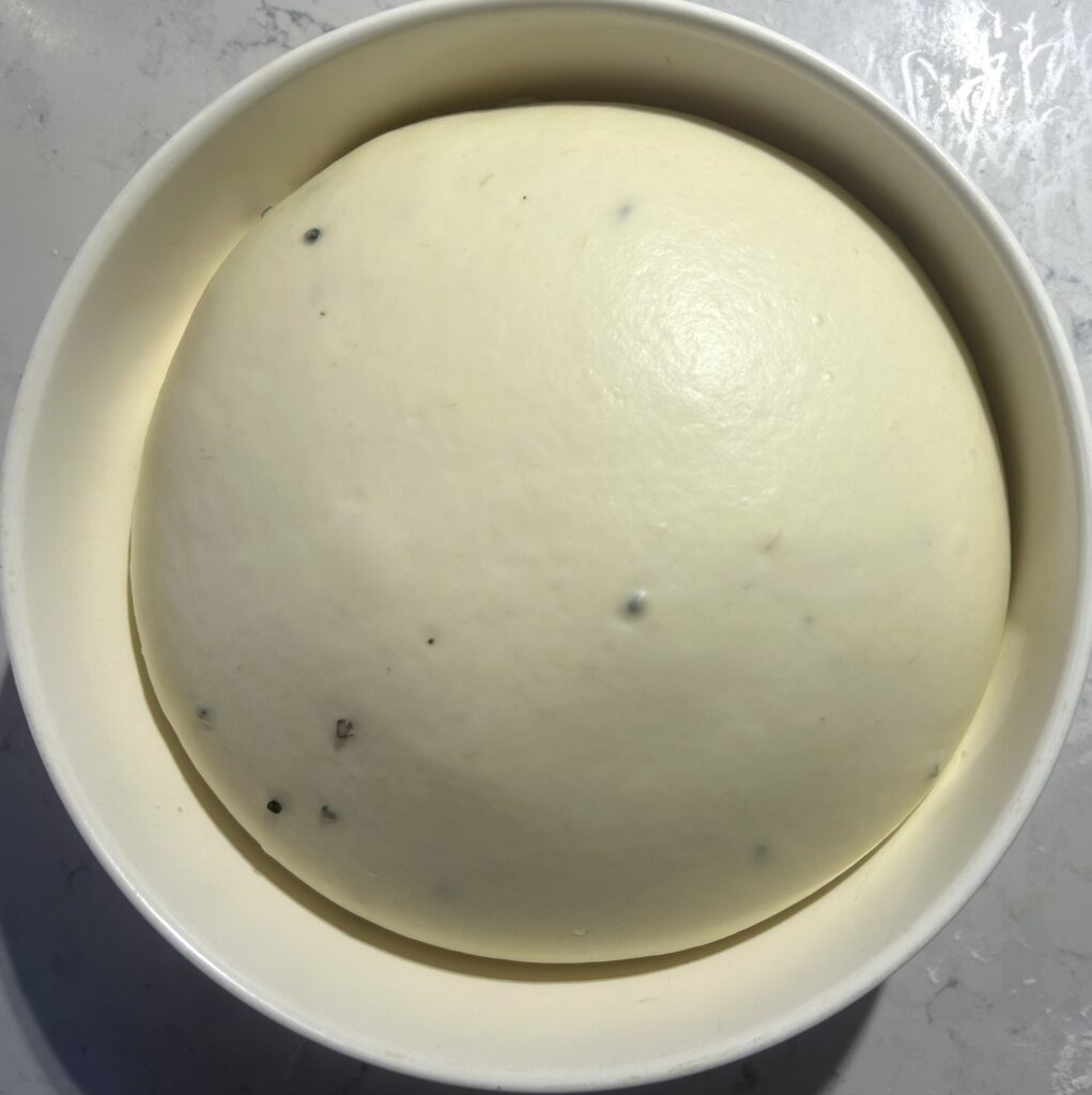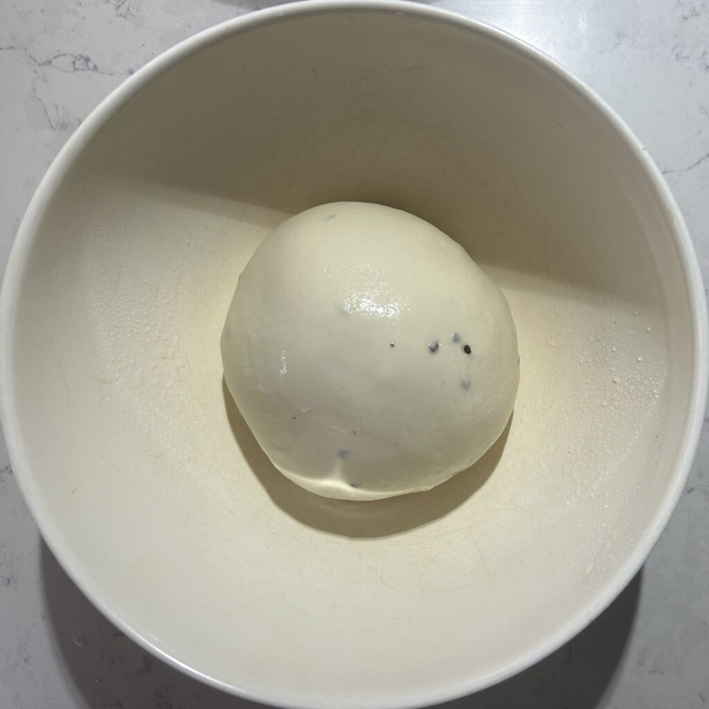 ❹生地を丸く整えたら、軽く霧吹きで水をかけて、ボールにラップをする。温かい室内において、生地の容量が焼く2倍から3倍になるまで、発酵させる。