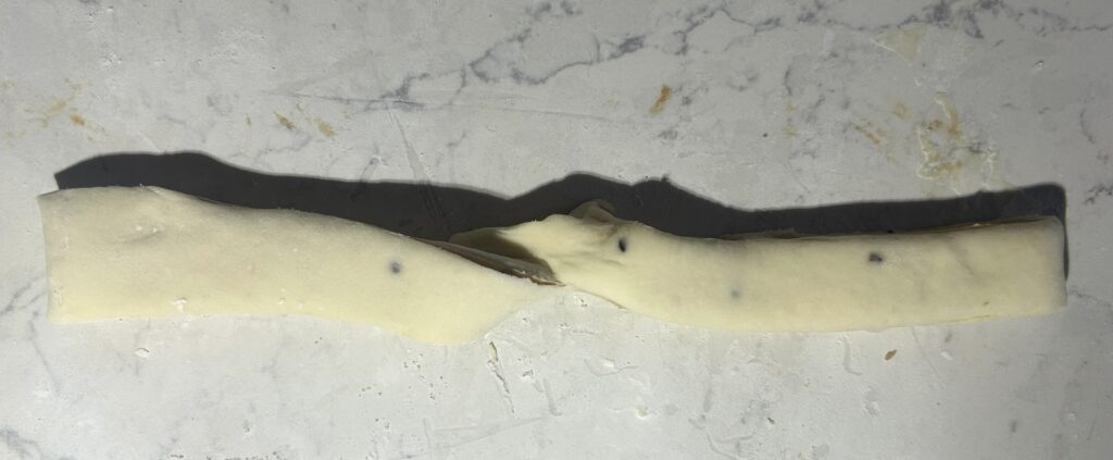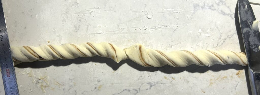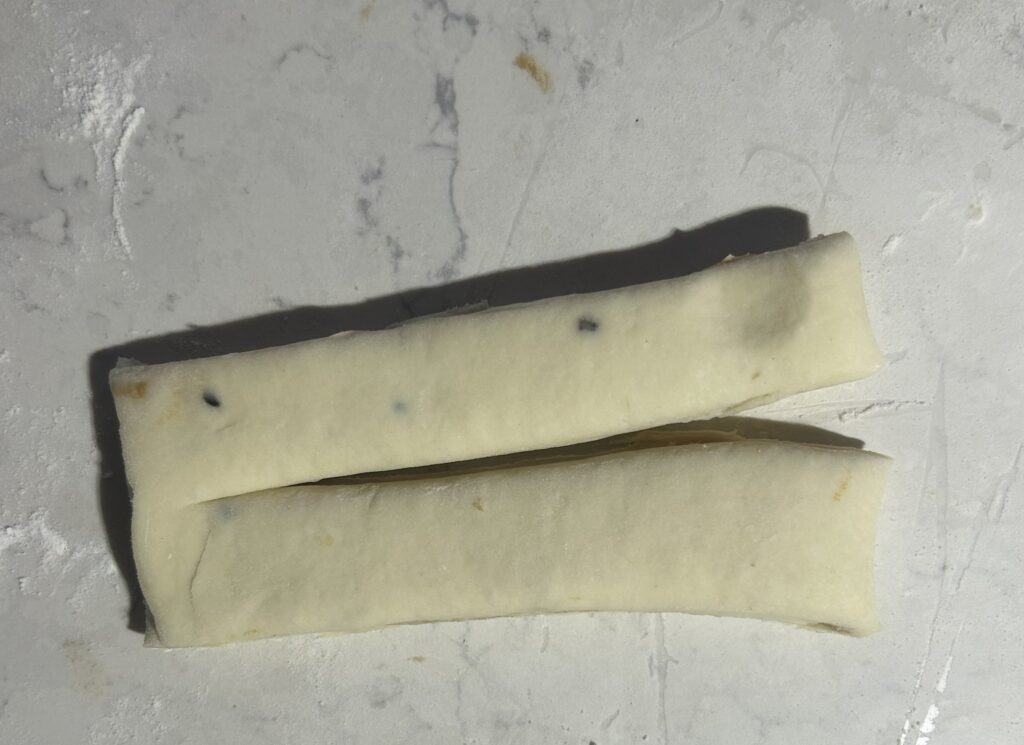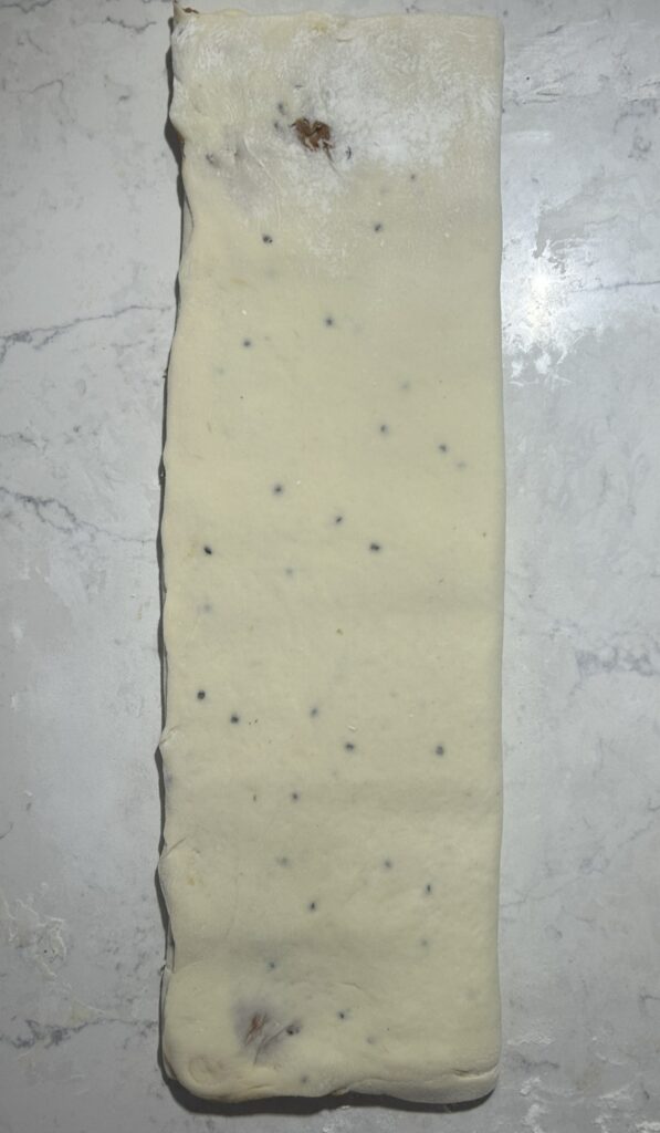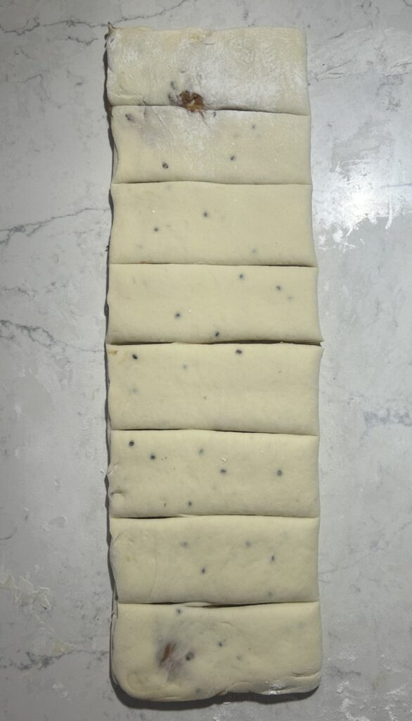 ❻❹ の生地を、麺棒を使いながら、生地の厚さが3ミリ程度の長方形に延ばす。生地の表面に3分の2の幅に、❺ のフィリングを満遍なく塗る。生地を三つ折りにして折りたたむ。生地が、8等分から10等分になるように、均等な帯状に切り分ける。