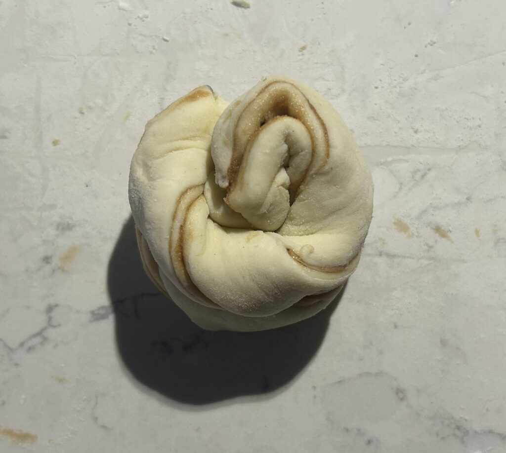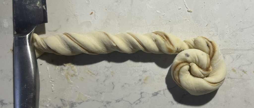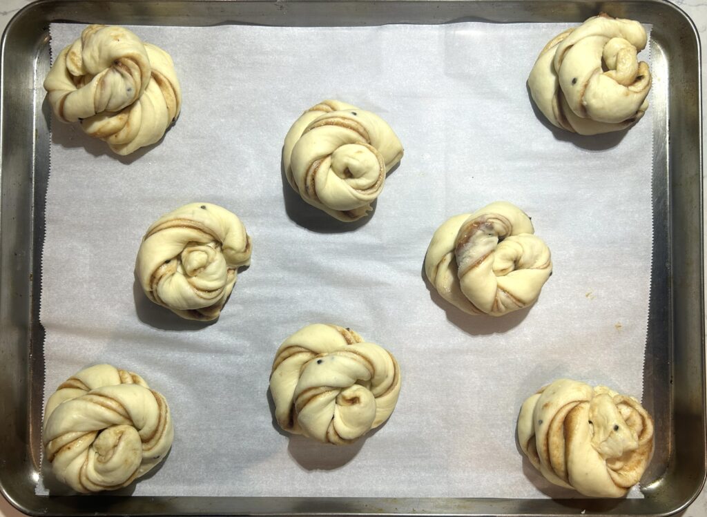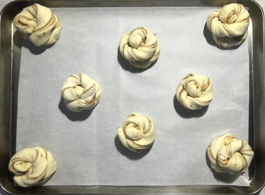 ❼生地をさらに2当分にするようにして、帯状にする。端を数回ねじってから、渦巻き状にまいて、ボール型に形成する。ベーキング用の紙を敷いた鉄板の上に、間隔をあけて並べる。温かい室温において、生地が一回り大きくなるまで、2次発酵させる。