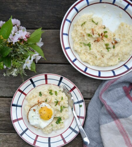 チキンブロスやベジタブルブロスで炊いてもいいのですが、水で炊いても十分に美味しいです。レシピはオリーブオイルを使っていますが、付け合わせる料理に合わせて、好みで、バターを使っても構いません。最後にイタリアンパセリや香菜など、ハーブの微塵切り混ぜています。これも好みのハーブでいいと思います。仕上げに好みで、摩り下ろしたパルメジャーノチーズを振りかけても美味しいです。