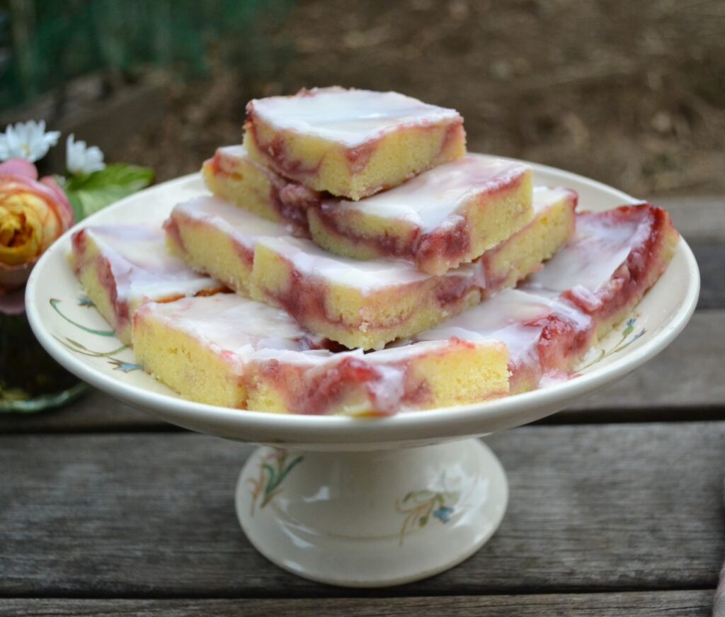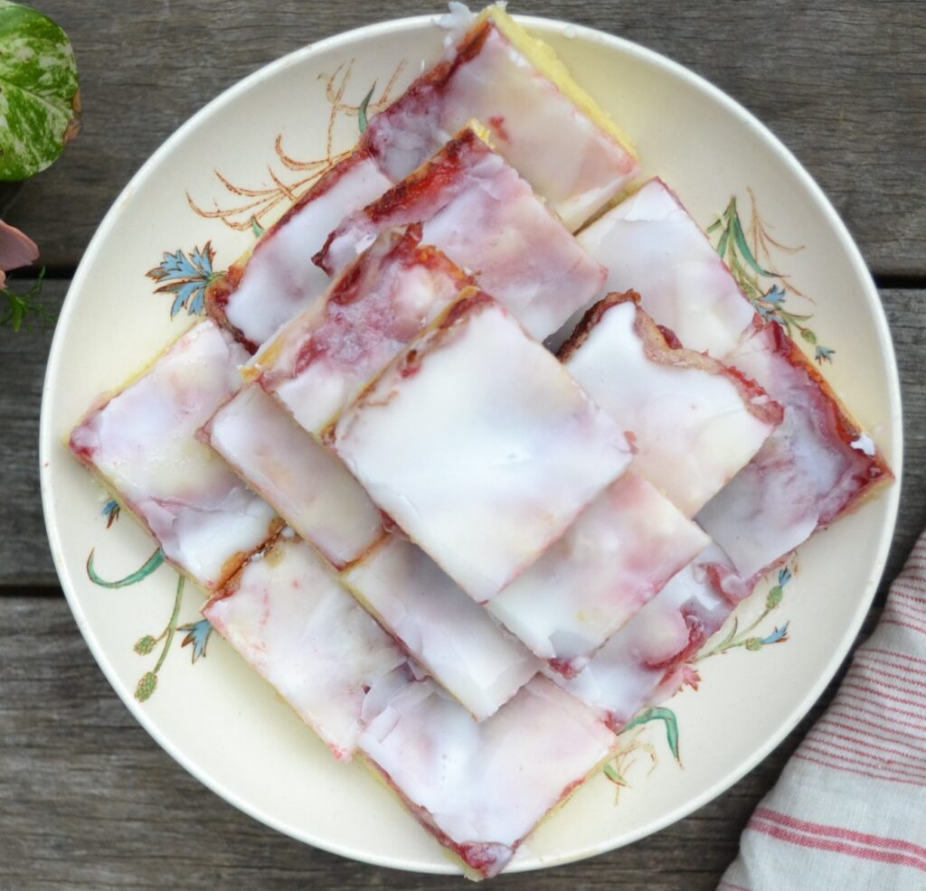 レモンの風味がきいたブラウニーに、苺のピューレを混ぜ合わせた、レモンストロベリーブラウニー (Lemon Strawberry Brownies) です。レモンの酸味と苺の風味はとてもよく合うし、彩も美しいです。表面に粉砂糖のアイシングを塗ってお化粧をしていますが、アイシングがなくても、十分美味しいです。