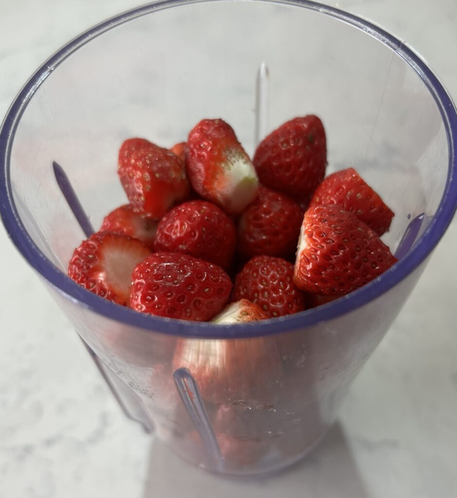 生地に混ぜ込む、苺のピューレを作ります。苺は蔕をとって、ミキサーに入れます。ミキサーで攪拌しやすいように、少量の水を加えます。