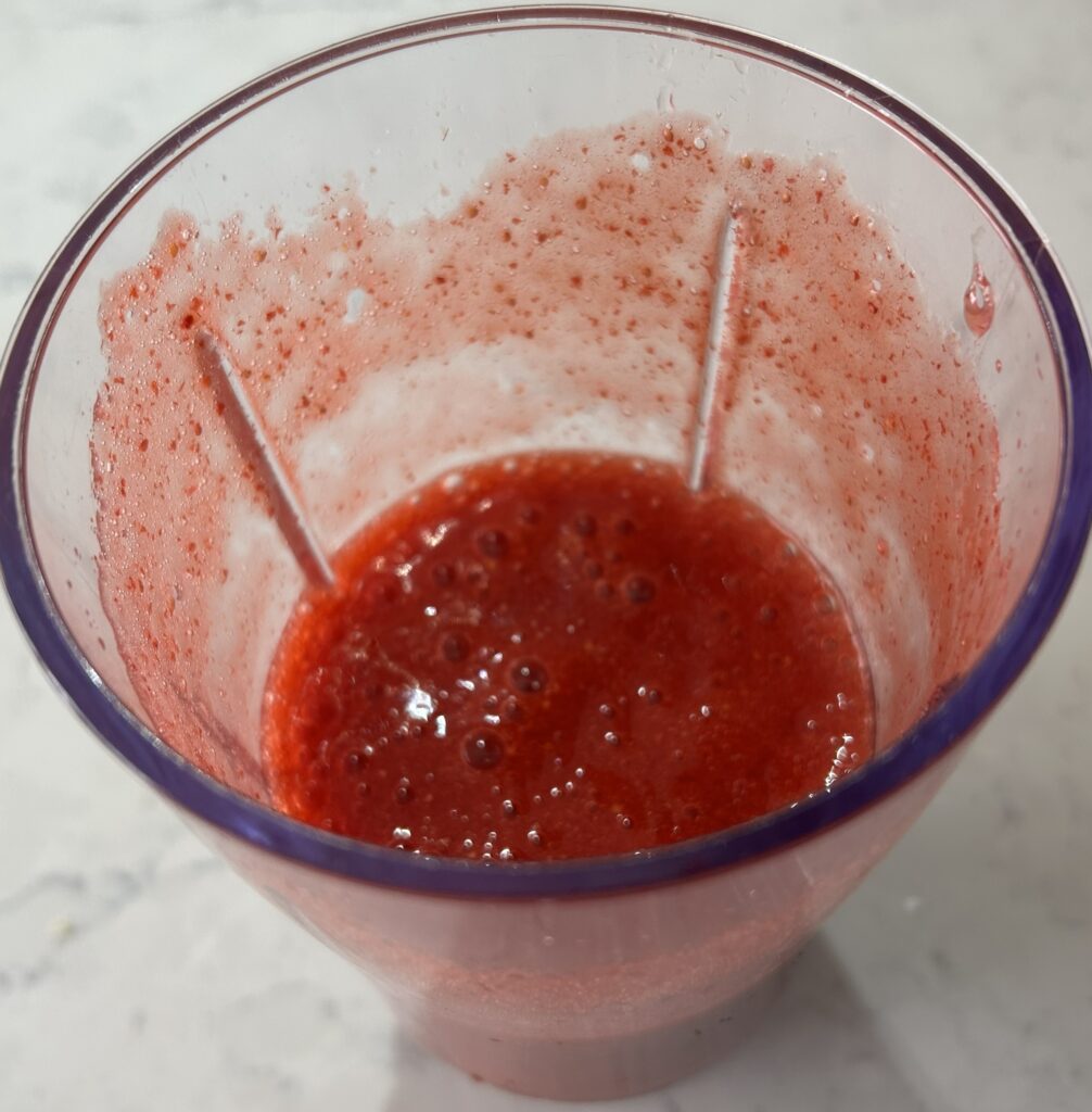 苺のピューレを作る。苺は蔕をとって、ミキサーに入れる。少量の水を加えて、ピューレ状になるまで、攪拌する。