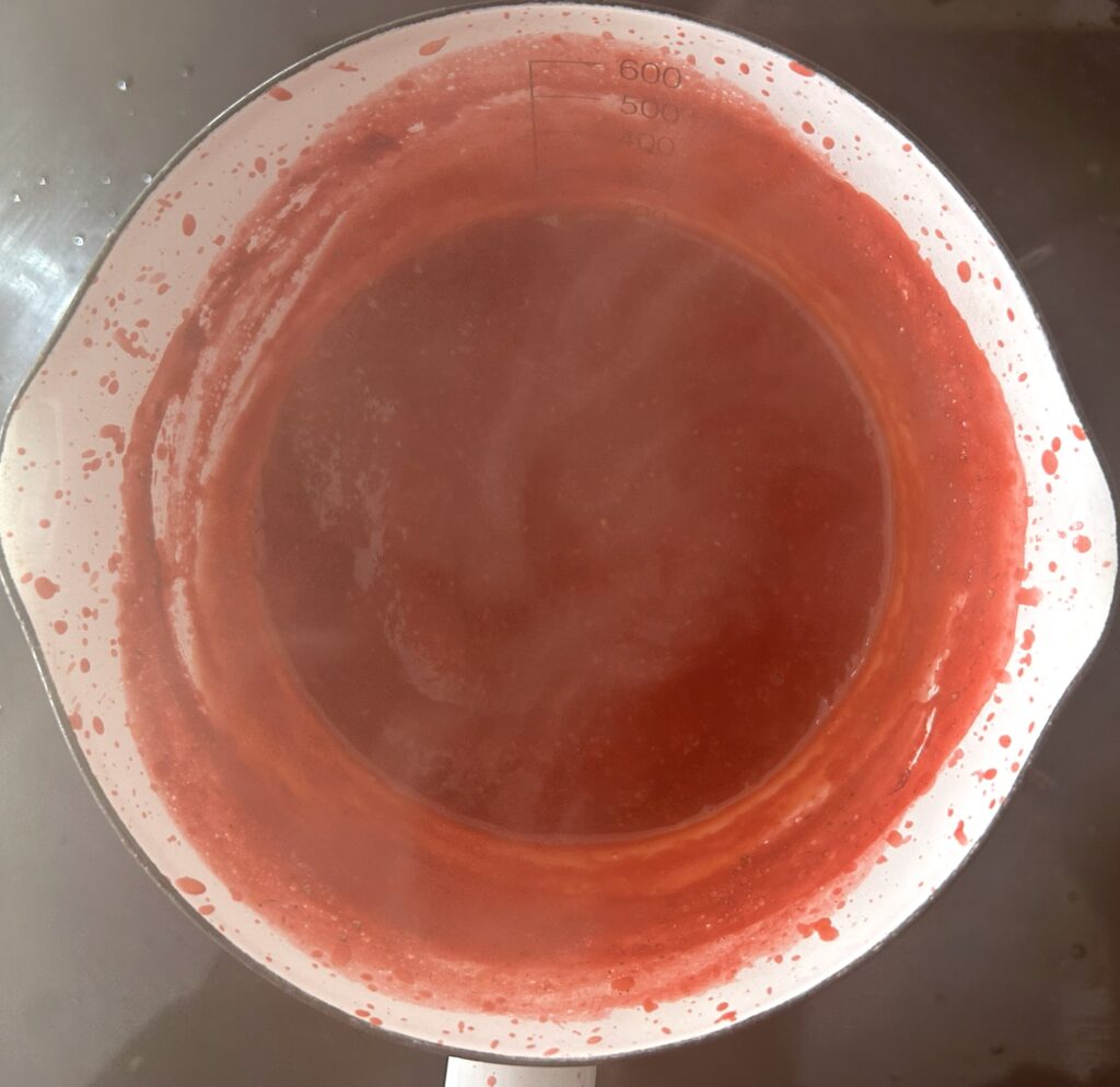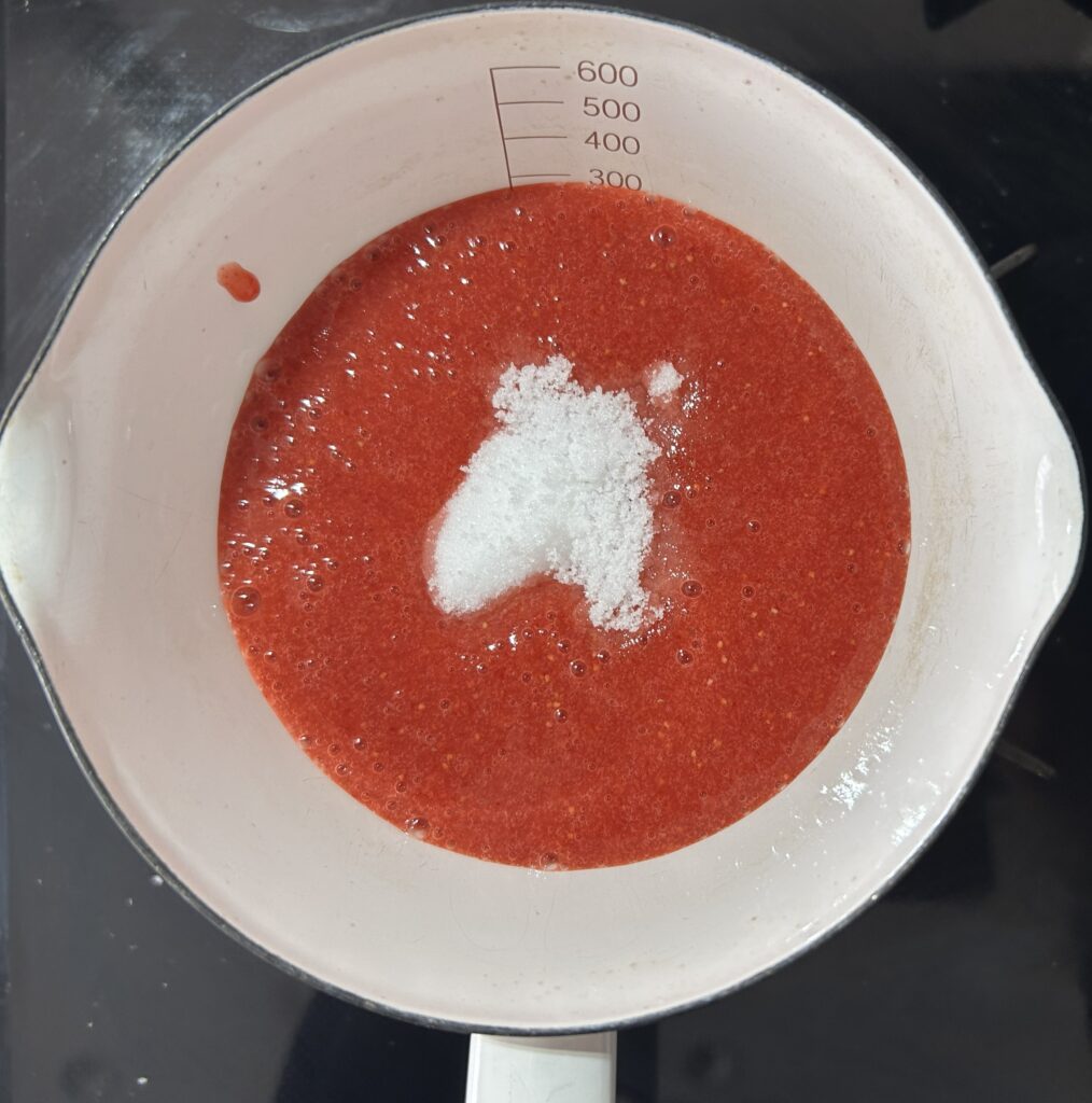 ピューレ状になった苺と砂糖を鍋に入れて、中火にかけます。