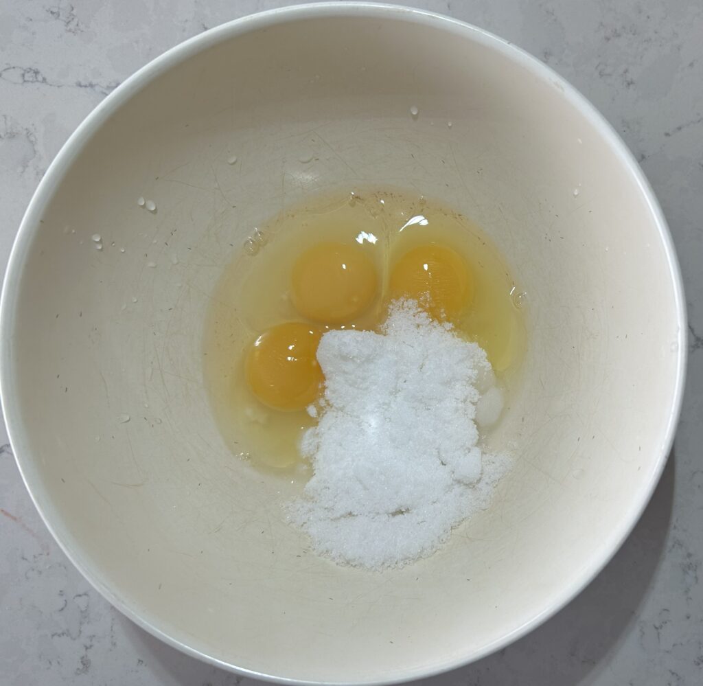 ブラウニーの生地を作ります。ボールに卵と砂糖を入れて、泡立て器で混ぜ合わせます。