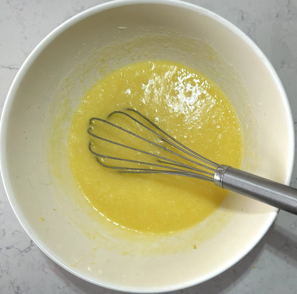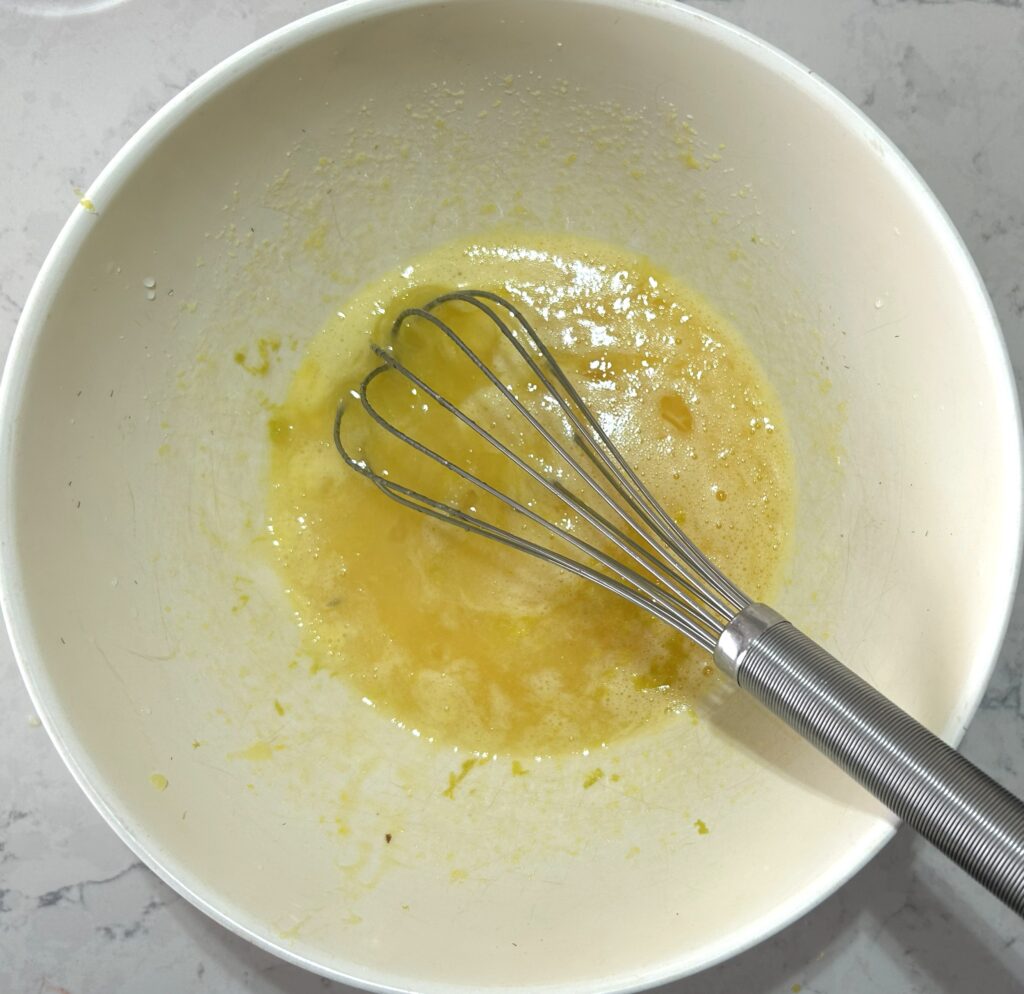 溶かした無塩バターを加えます。レモンの果汁、摩り下ろしたレモンの皮も加えて、全体を混ぜます。