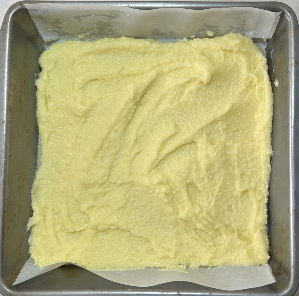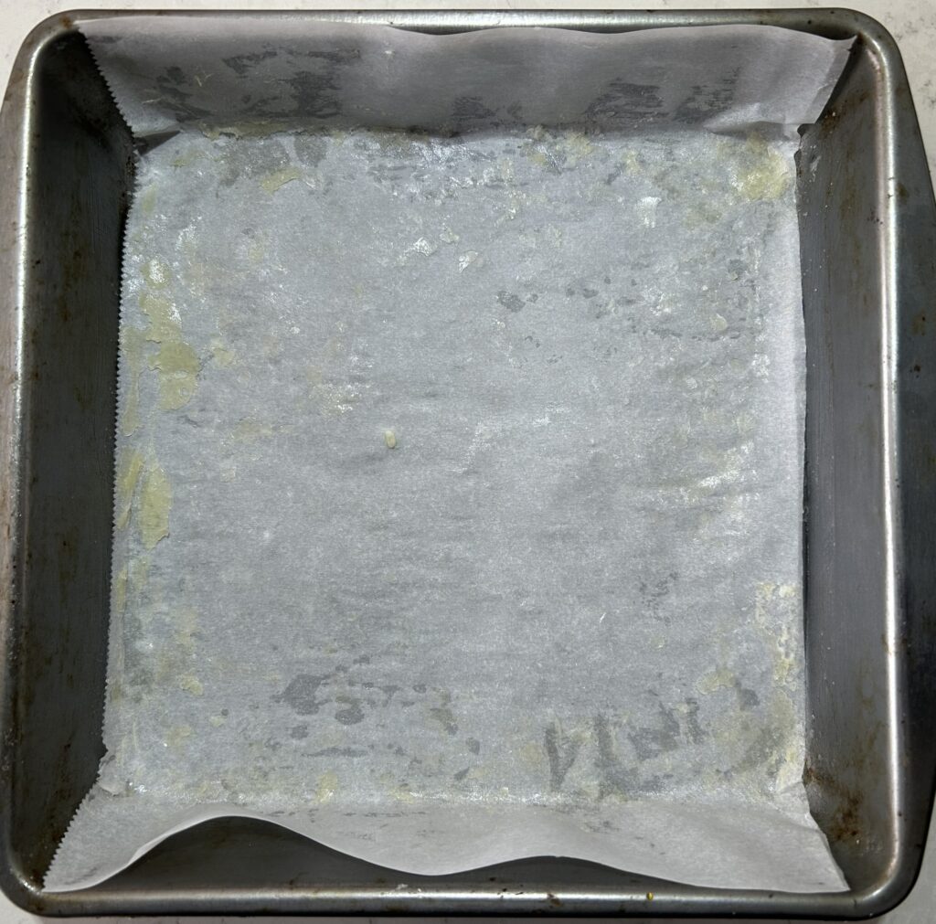 焼き型にベーキング用の紙を敷いて、薄く溶かしたバターを塗っておきます。