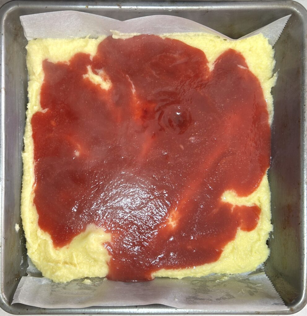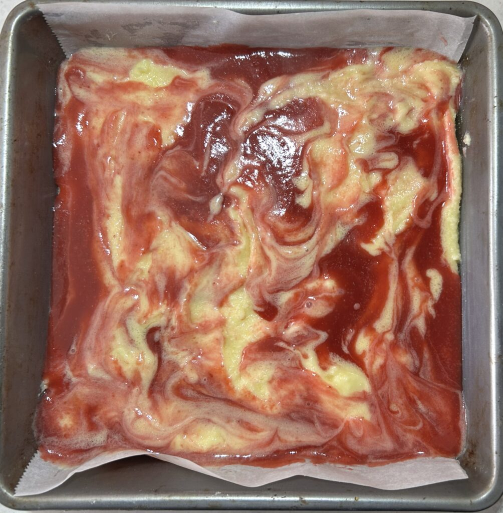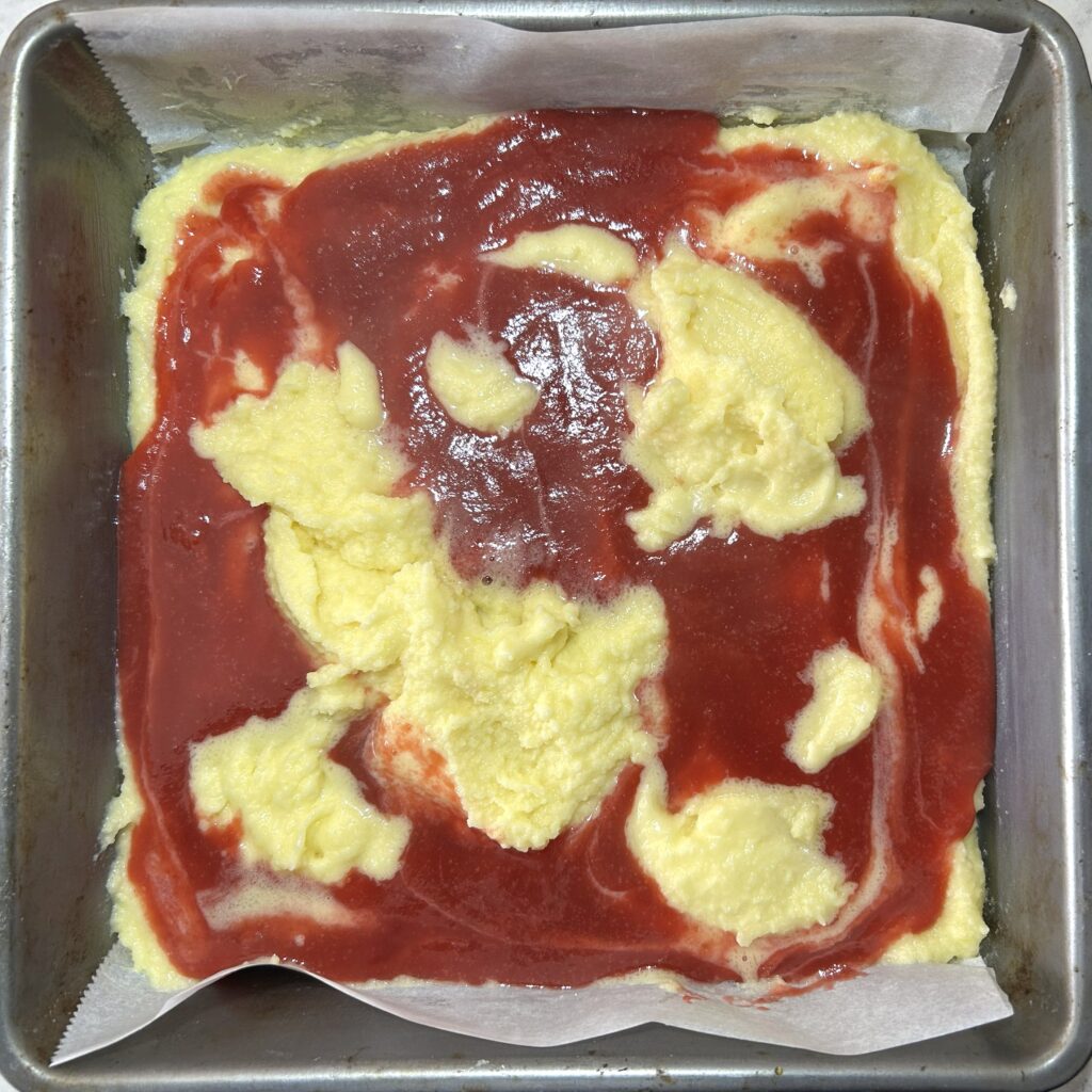 用意した焼き型に、 の生地の半量を流し入れる。苺のピューレをその上にのせてから、残りの生地を上に数か所にわけて、のせる。ナイフなどを垂直方向に立てるようにして、全体を軽く混ぜ合わせる。