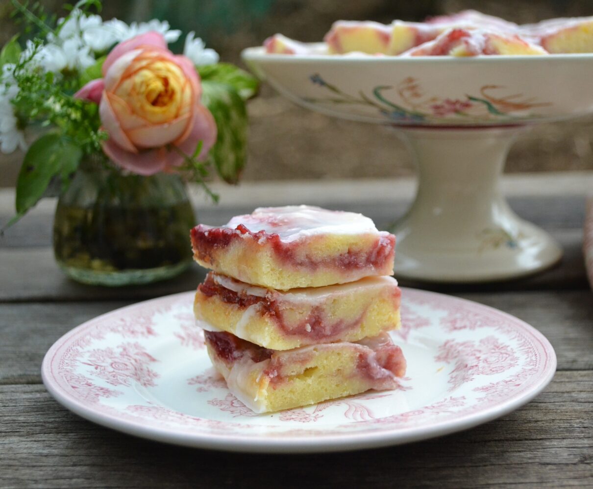 レモンの風味がきいたブラウニーに、苺のピューレを混ぜ合わせた、レモンストロベリーブラウニー (Lemon Strawberry Brownies) です。レモンの酸味と苺の風味はとてもよく合うし、彩も美しいです。表面に粉砂糖のアイシングを塗ってお化粧をしていますが、アイシングがなくても、十分美味しいです。