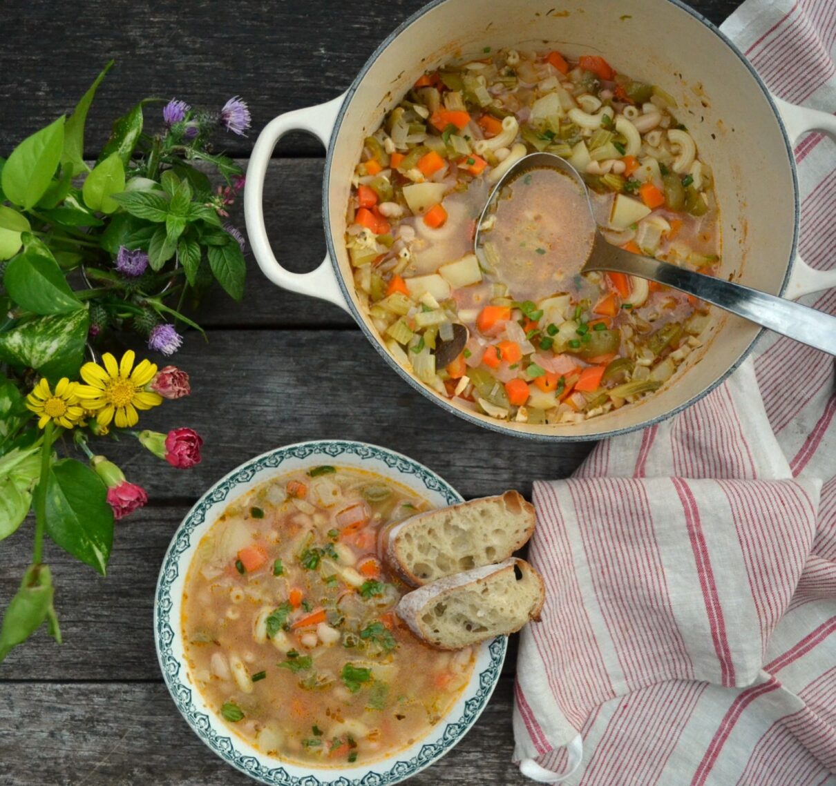 野菜をたっぷりと使ったイタリアのスープ、ミネストローネ (Minestrone) です。イタリアのミネストローネは、ベーコンなどの動物性の食材は使わず、様々な野菜を中心にして、隠し味としてパルメジャーノを加えて、味を調えます。アメリカのレシピは、トマト缶やトマトペーストを使った、トマトが多めの濃いスープも多いですが、一つ一つの野菜の風味を壊さない程度に、トマトを加える方が、ミネストローネらしいと思います。小さめのショートパスタや、お米を入れたり、ファッロなど小麦を入れることによって、単なる脇役ではなくて、メインディッシュのような存在感のあるスープに仕上がります。レシピ通りに毎回決まった材料で作るというよりかは、どちらかというと、冷蔵庫やパントリーにあるものを臨機応変に使う、とてもカジュアルで家庭的なスープです。