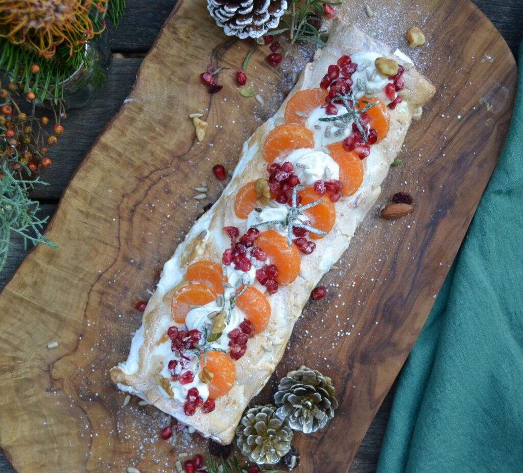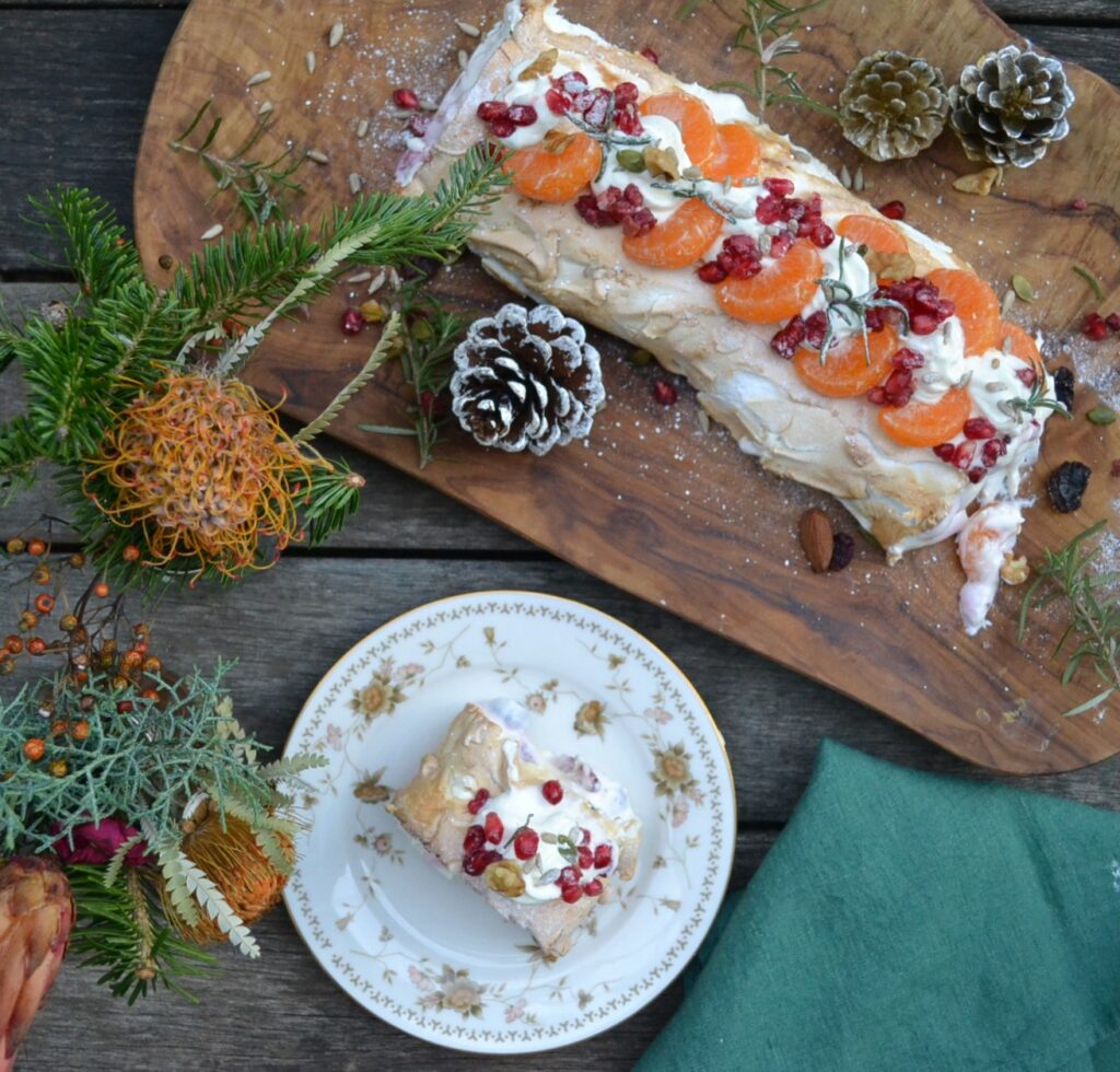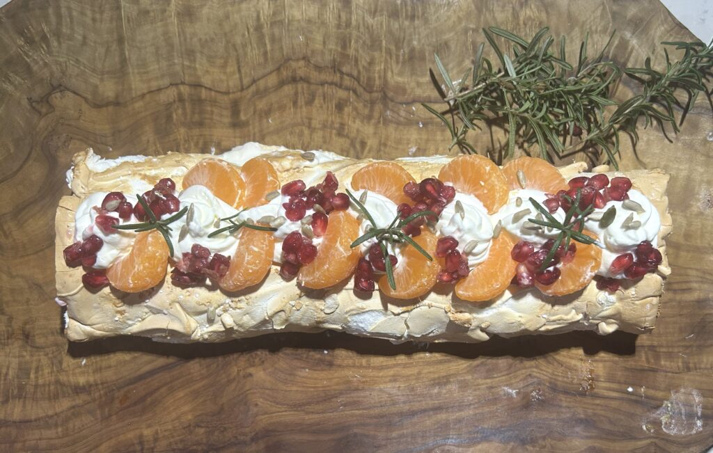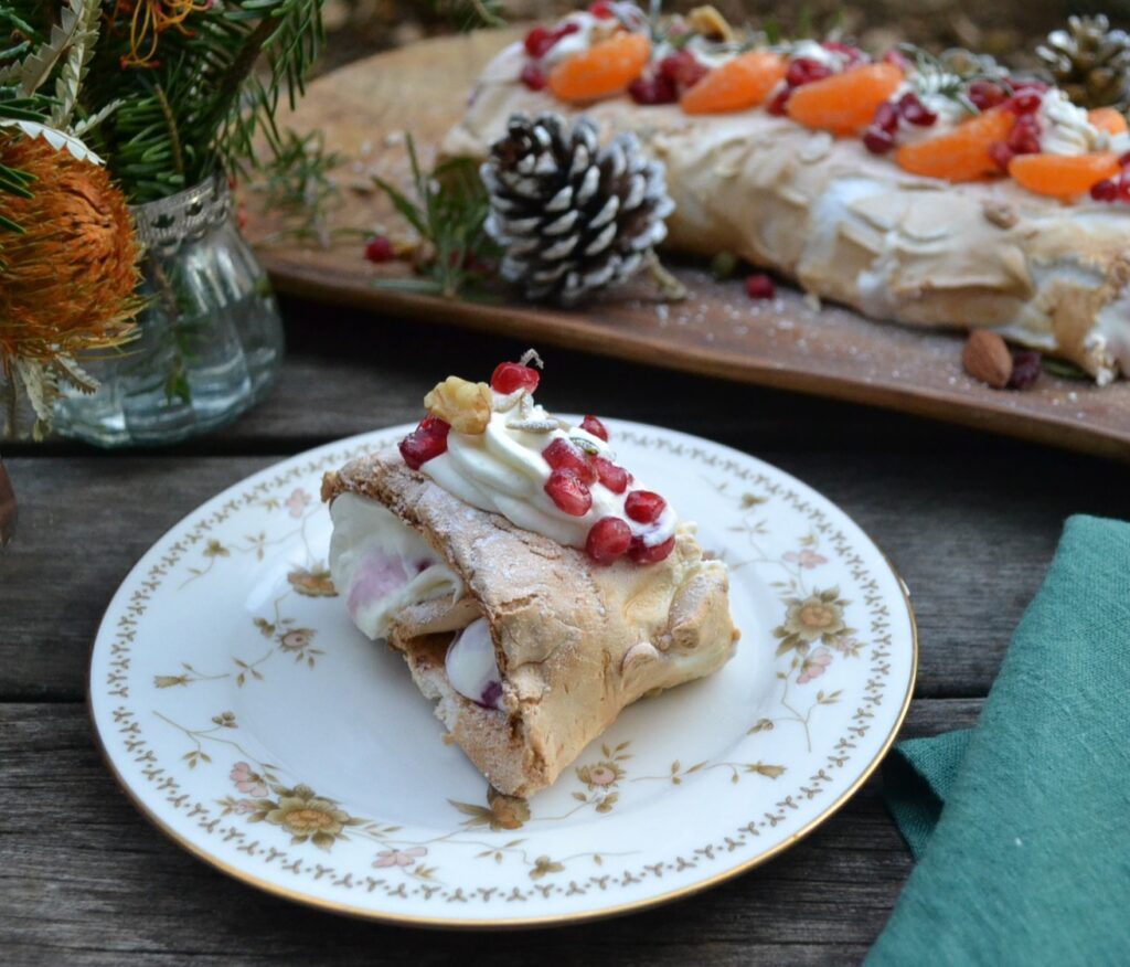 パブロバをロールケーキのように仕上げた、パブロバロール (pavlova roll) です。パブロバは、メレンゲで作るオーストラリアとニュージーランドのお菓子です。材料は、卵白と砂糖がメインで、とてもシンプルですが、大きさ、形を自由にかえることでき、添えるクリームやフルーツを変えることで、様々なバラエティーを楽しめます。ロールケーキのようなパブロバは、見た目が華やかで、一人分ずつとりわけやすく、多くの人が集まるときの、メインのデザートとしてもむいています。