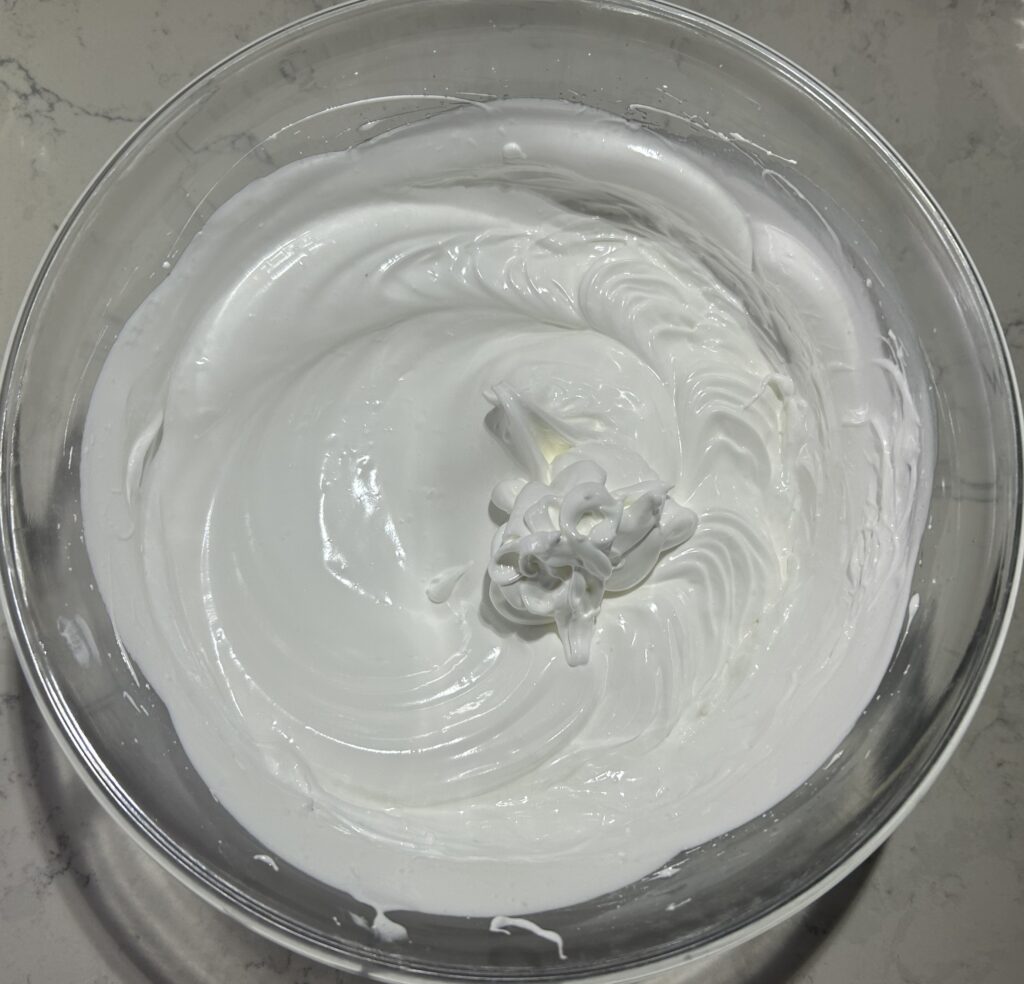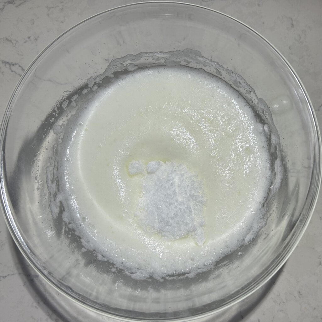 硬くなってきたら、お酢、コーンスターチを加えて、角が立つまで、泡立てます。お酢の種類は風味がうすいものを選びます。レモンの果汁でもいいです。