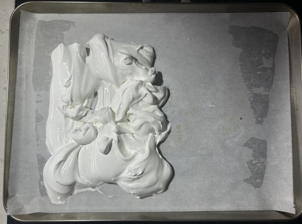 鉄板の上にベーキング用の紙をしいて、薄く油をひきます。その上にメレンゲをのせます。