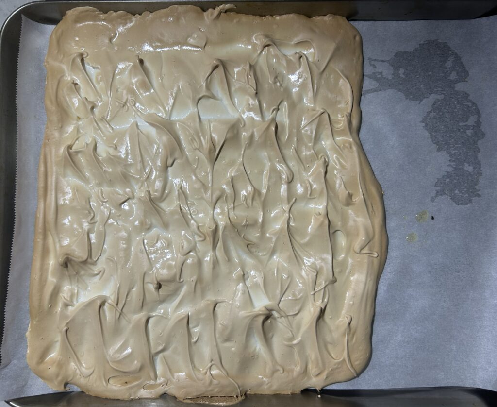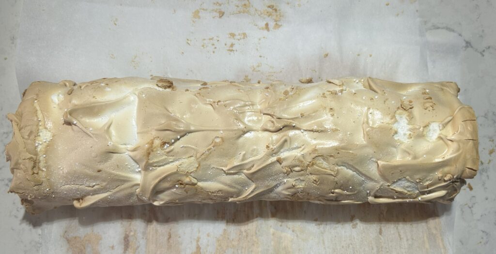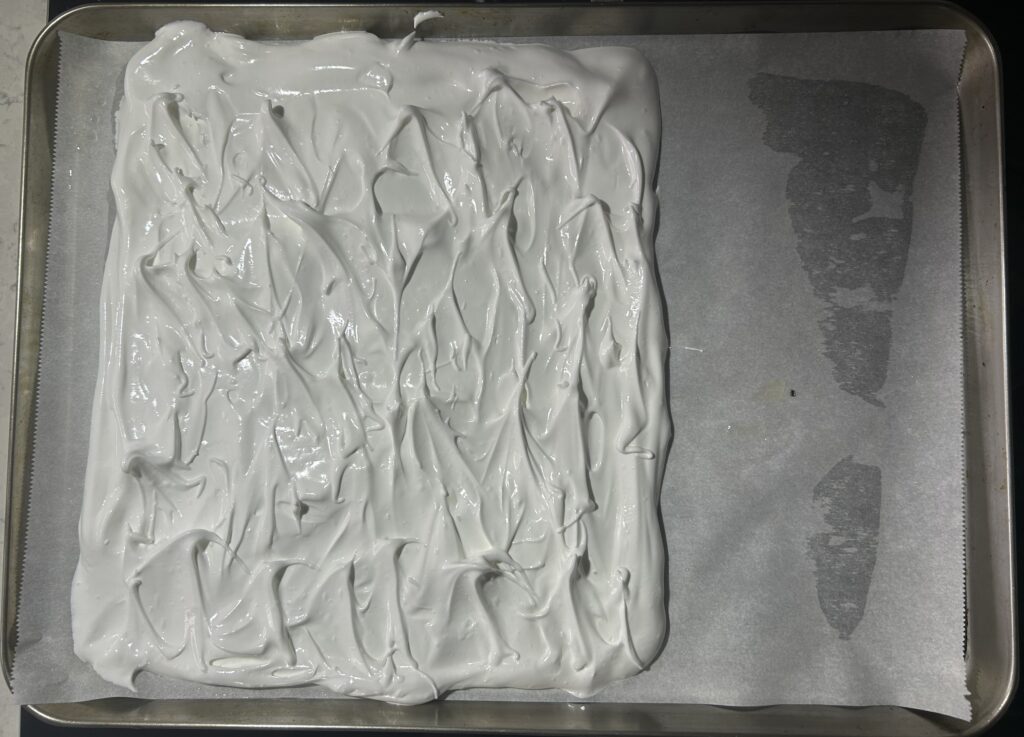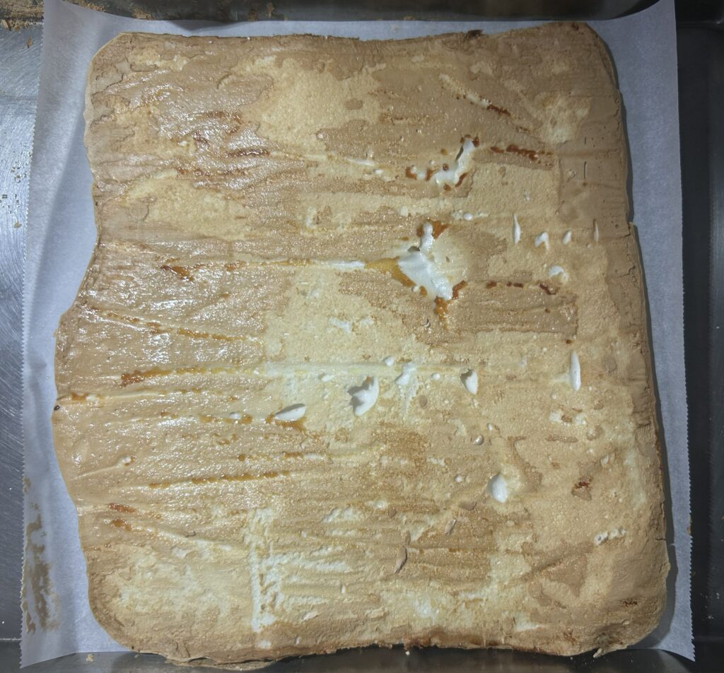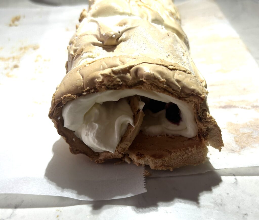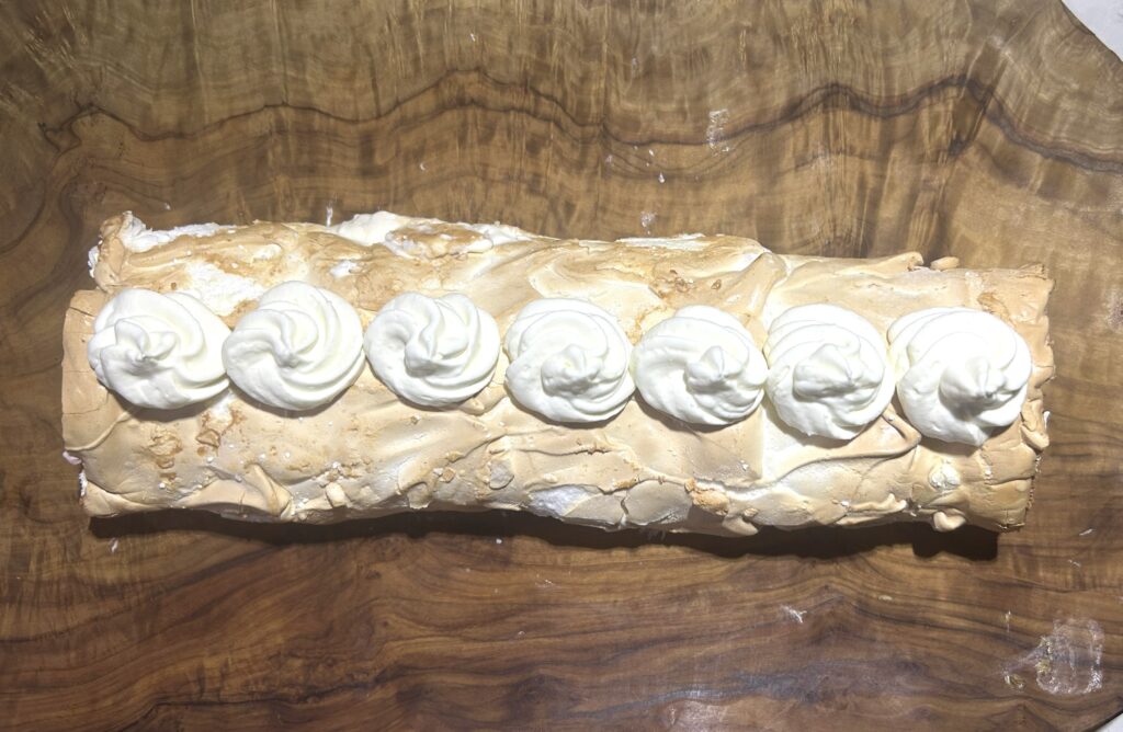 パプロバの土台となるベースは、卵白に砂糖とコーンスターチを加えて、メレンゲを作り、オーブンで焼いて作ります。ロールケーキのように形成するためには、外側は出来るだけかりっと乾燥させて、中はマシュマロのように軟らかく焼き上げる必要があります。出来るだけ、低温のオーブンでじっくりと焼いて、焼き上がってから、オーブンの中に入れて、予熱をあてながら、乾燥させるようにするのもポイントです。