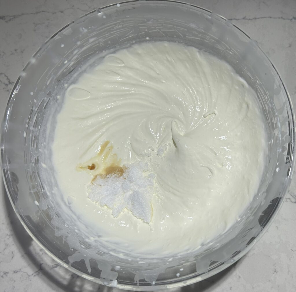 ❺生クリームとクリームチーズをボールに入れて、クリームチーズと生クリームを混ぜ合わせる。その後、泡立て器で、角がたつまで泡立てる。最後の粉砂糖、バニラエクストラクトを加える。