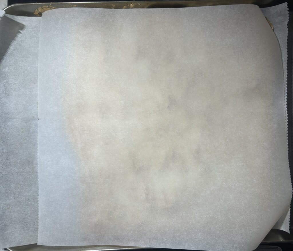 ❸ベーキング用の紙を敷いて、薄く油をひく。その上に、厚さ1.5センチ、短辺25センチ程度の長方形に広げる。表面を軽くならしてから、うろこ状に形を調える。