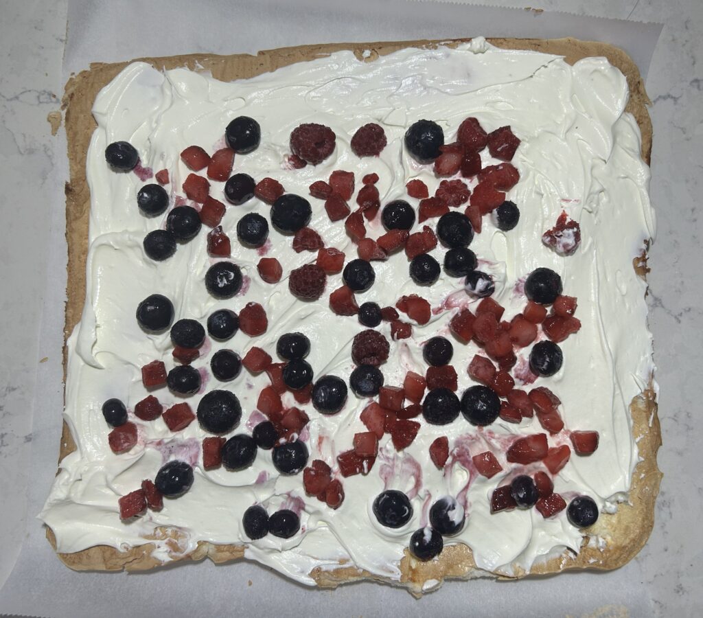 ❻焼きあがったパブロバにベーキング用の紙をのせて、上下逆さまにするようにして、型から出す。鉄板に敷いたベーキング用の紙をはずして、巻き込むときに内側になる方の生地に、軽く切目を入れる。表面に、❺ のクリームを満遍なく塗る。(飾り用のクリームを少量残しておく) ミックスベリーを表面に散らしてから、生地をロール状に巻いていく。