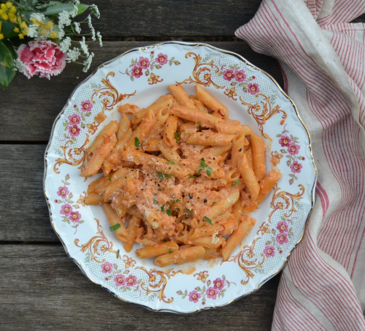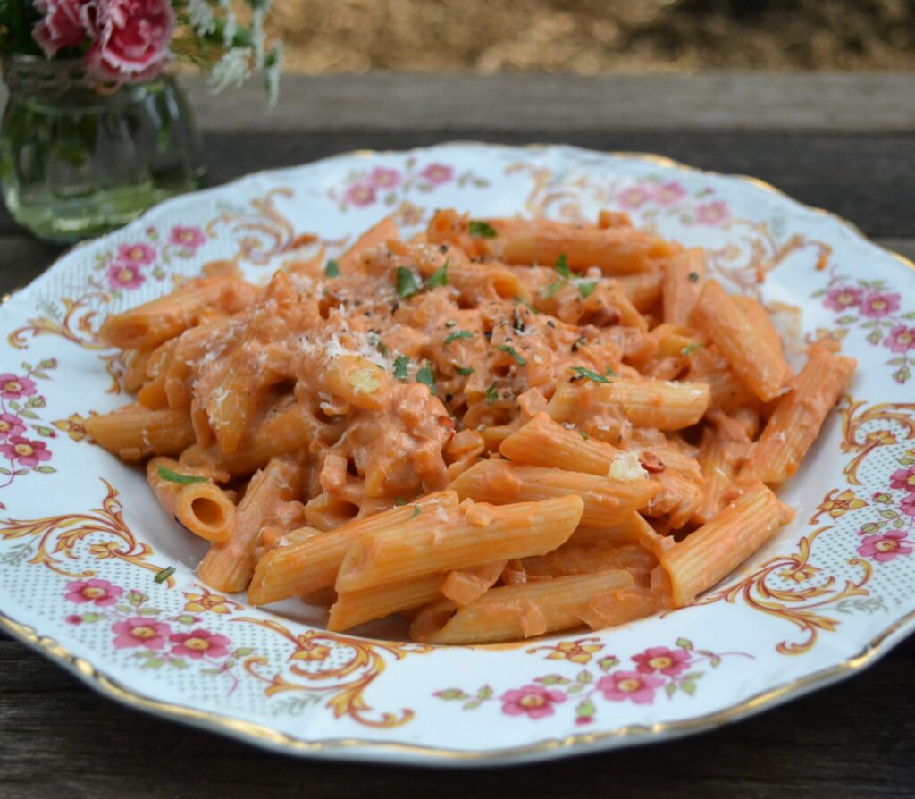 トマトソースにクリームを加えて、ウォッカで香りづけしたソースに、パスタを絡めて作る、ペンネアラウォッカ (Penne alla Vodka) です。ペンネアラウォッカの発祥は、イタリアなのか、アメリカなのか、はっきりとはしていませんが、とてもアメリカでポピュラーなパスタです。トマトソースと生クリームを合わせると、分離しやすいのですが、ウォッカ加えることで、ソースが乳化して、とてもマイルドでクリーミーなソースに変わります。ウォッカは、くせのないお酒なのですが、アルコール度数が高いので、少量加えるだけで、しっかりとしたウォッカの風味をつけることができます。同時に、トマトの酸味を和らぎ、甘みがより感じられて、食べやすいソースになります。