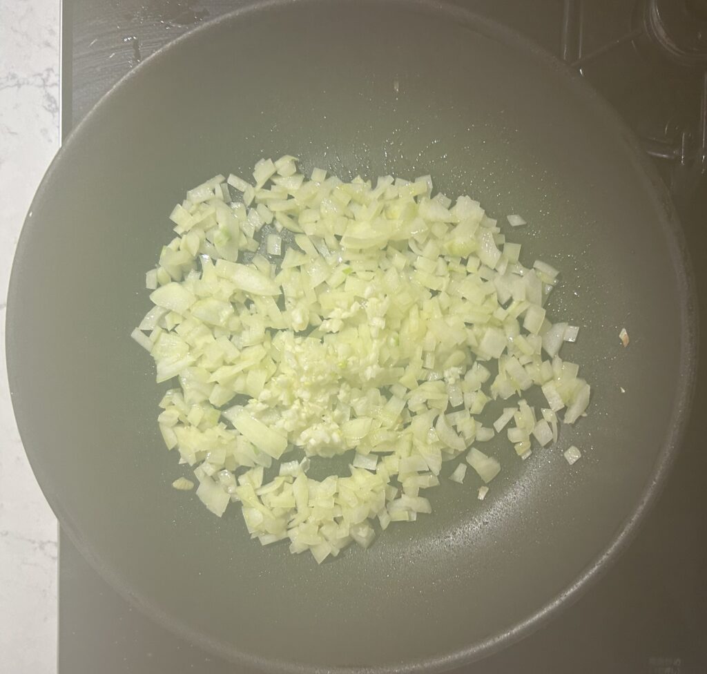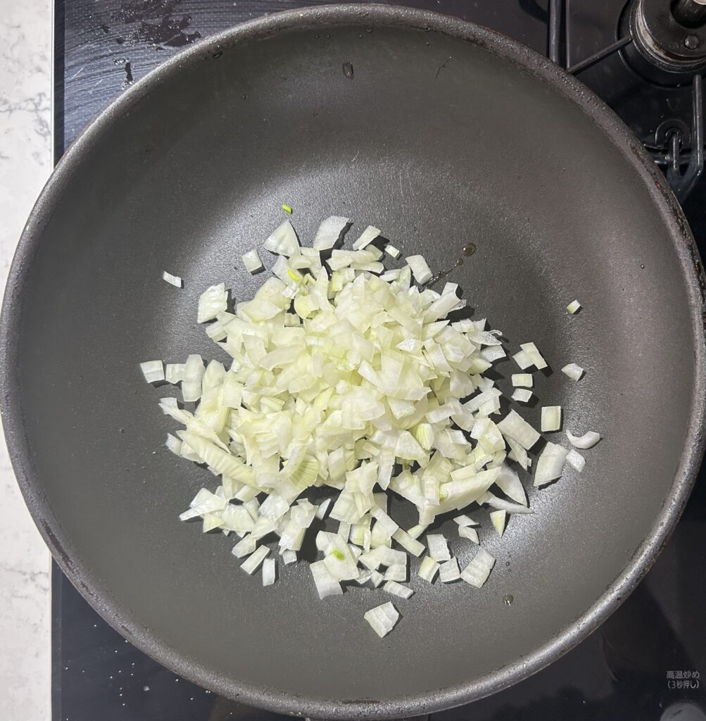 オリーブオイルをひいたフライパンに、玉ねぎを入れて中火にかけ、玉ねぎを炒めます。