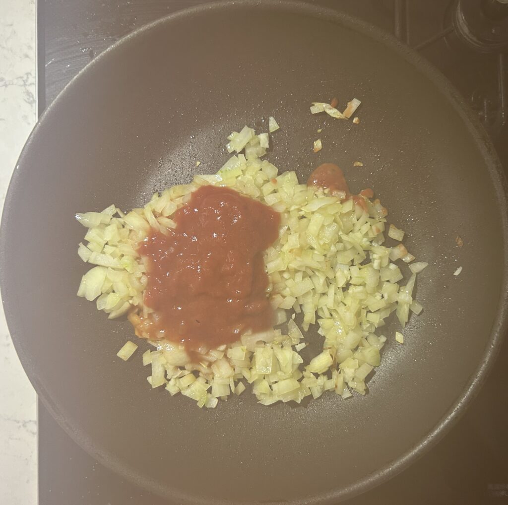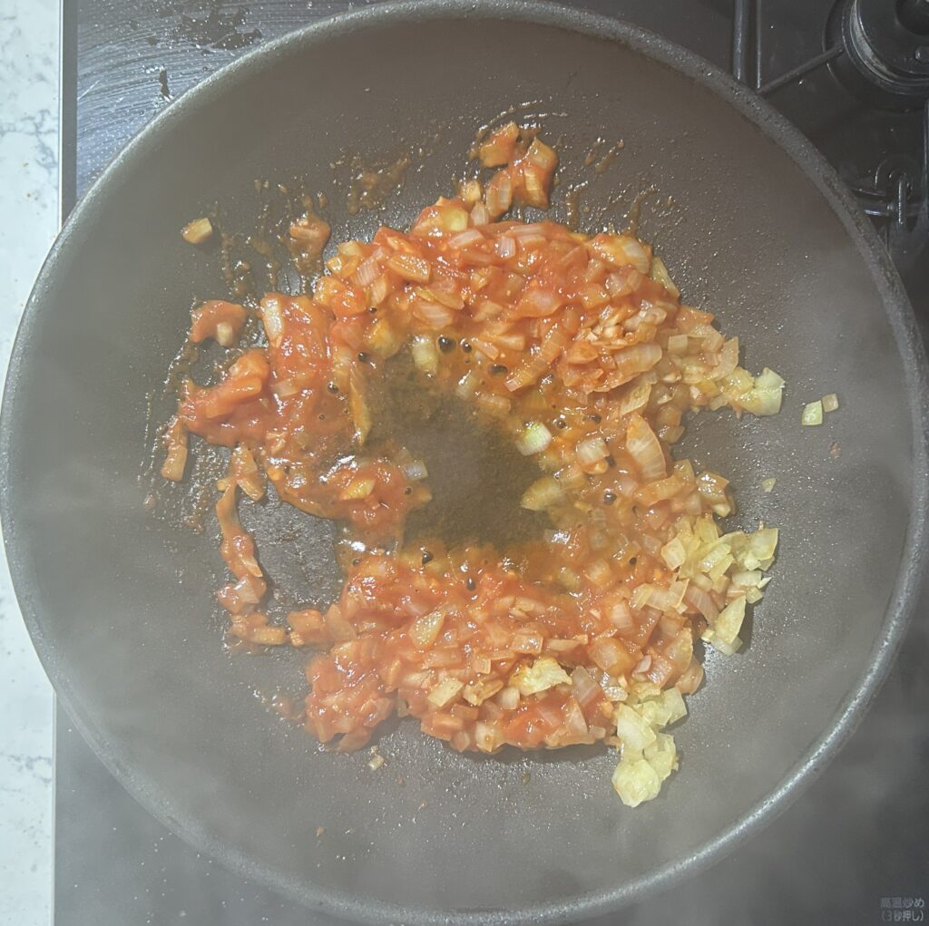 ❸フライパンにオリーブオイルと刻んだ玉ねぎ入れて、中火にかける。玉ねぎがしんなりとしてきたら、ニンニクを加える。ニンニクの香りがたってきたら、刻んだ赤唐辛子、トマトピューレ入れて、軽くかき混ぜながら炒める。塩、黒胡椒、オレガノを加えて、軽く味をつけてかき混ぜる。
