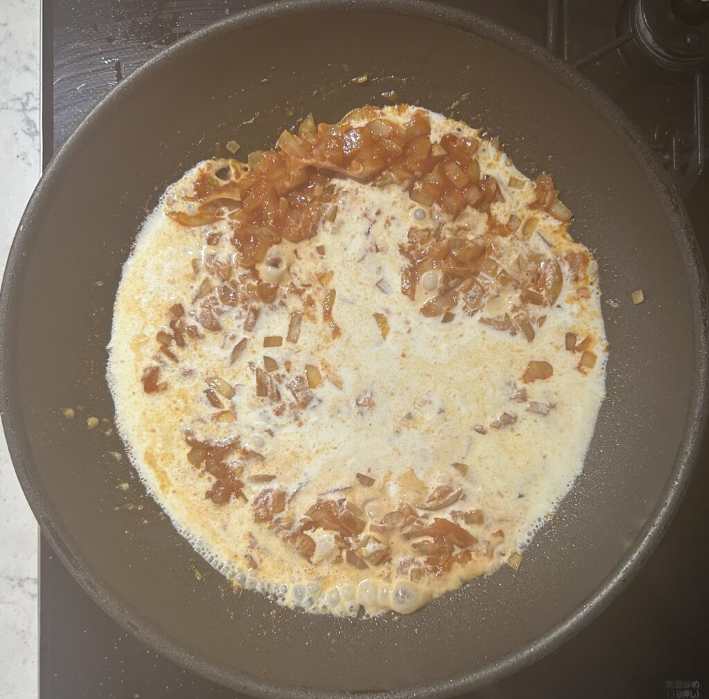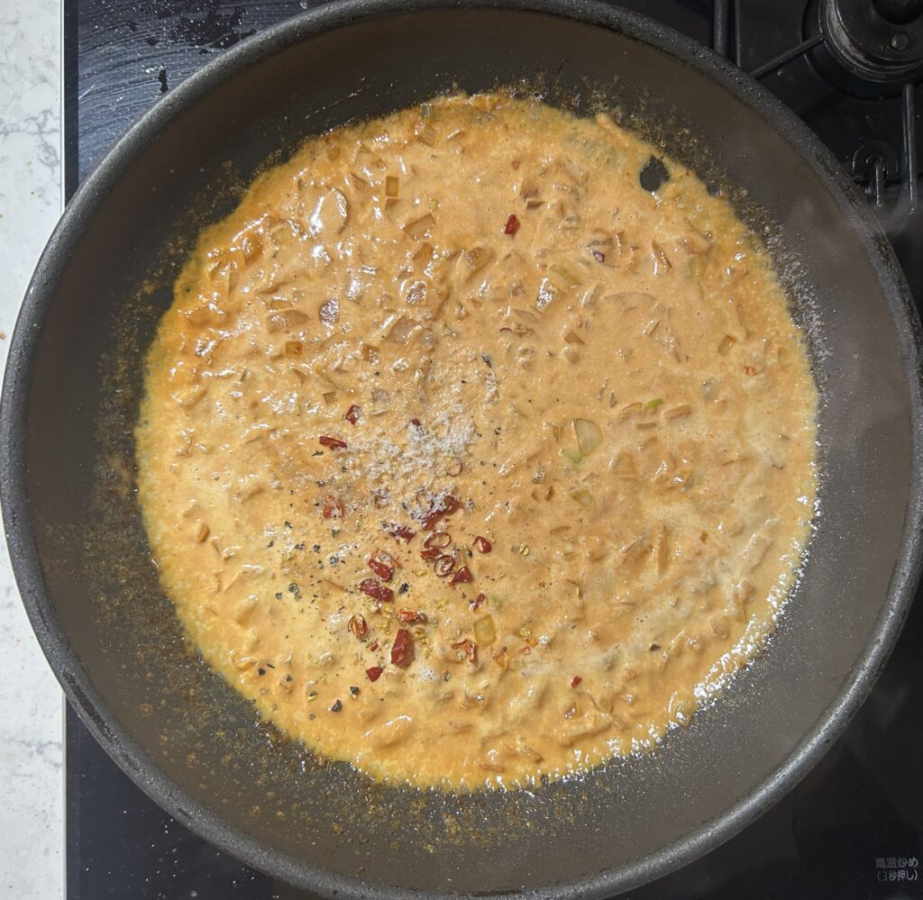 ウォッカを加えて、沸騰するまで、十分に火を通して、アルコールを飛ばします。
