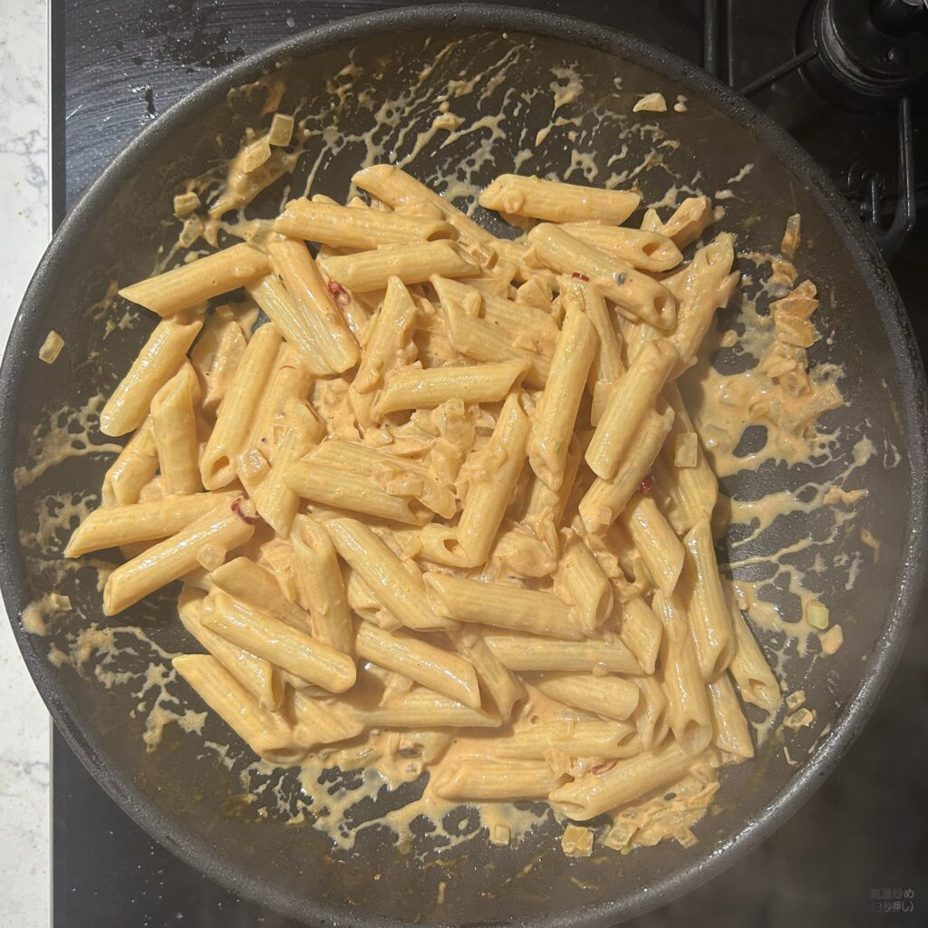 茹で上がったパスタを加えます。このパスタには、伝統的にペンネが使われることが多いです。